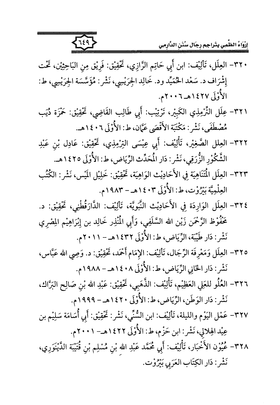 ٣٢٠ - العِلَل، تَألِيْف: ابن أَبِي حَاتِم الرَّازِي، تَحْقِيْق: فَرِيْق مِنِ البَاحِثِيْن، تَحْت إِشْرَاف د. سَعْد الحُمَيِّد ود. خَالِد الجِرَيْسِي، نَشْر: مُؤَسَّسَة الجِرَيْسِي، ط: الأُوْلَى ١٤٢٧ هـ -٢٠٠٦ م.