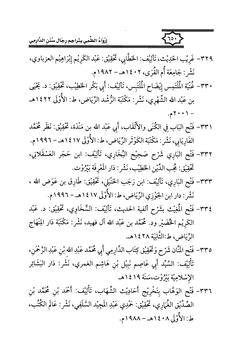 ٣٣٥ - فَتْح المَنَّان شَرْح وَتَحْقِيْق كِتَاب الدَّارِمِي أَبِي مُحَمَّد عَبْدِ الله بْنِ عَبْدِ الرَّحْمَنِ، تَأْلِيْف: السَّيِّد أَبِي عَاصِم نَبِيْل بْنِ هَاشِم الغمري، نَشر: دَار البَشَائِر الإِسْلامِيّة بَيْرُوْت، سَنَة ١٤١٩ هـ.
