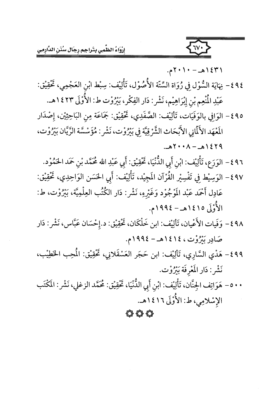 ٤٩٥ - الوَافِي بالوَفَيَات، تَألِيْف: الصَّفَدِي، تَحْقِيْق: جَمَاعَة مِنِ البَاحِثِيْن، إِصْدَار المَعْهَد الأَلْمَانِي الأَبْحَاث الشَّرْقِيَّة فِي بَيْرُوْت، نَشْر: مُؤَسْسَّة الرَّيَّان بَيْرُوْت، ١٤٢٩ هـ -٢٠٠٨ هـ.