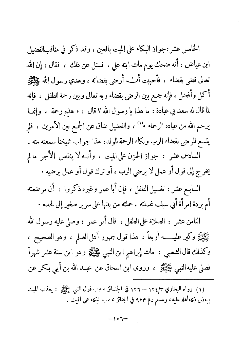 الْخَامِس عشر جَوَاز الْبكاء على الْمَيِّت بِالْعينِ وَقد ذكر فِي مَنَاقِب الفضيل ابْن عِيَاض أَنه ضحك يَوْم مَاتَ ابْنه عَليّ فَسئلَ عَن ذَلِك فَقَالَ إِن الله تَعَالَى قضى بِقَضَاء فَأَحْبَبْت أَن أرْضى بِقَضَائِهِ وهدي رَسُول الله صلى الله عَلَيْهِ وَسلم أكمل وَأفضل فَإِنَّهُ جمع بَين الرضى بِقَضَاء ربه تَعَالَى وَبَين رَحْمَة الطِّفْل فَإِنَّهُ لما قَالَ لَهُ سعد بِي عبَادَة مَا هَذَا يَا رَسُول الله قَالَ هَذِه رَحْمَة وَإِنَّمَا يرحم الله من عباده الرُّحَمَاء والفضيل ضَاقَ عَن الْجمع بَين الْأَمريْنِ فَلم يَتَّسِع للرضا بِقَضَاء الرب وبكاء الرَّحْمَة للْوَلَد هَذَا جَوَاب شَيخنَا سمعته مِنْهُ