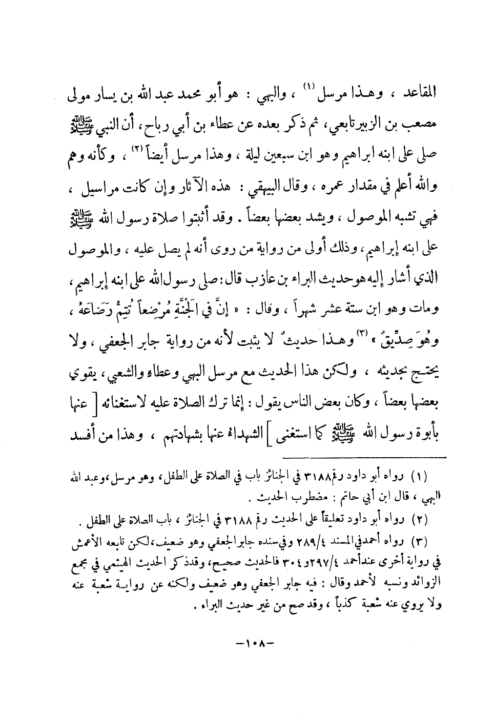 المقاعد وَهَذَا مُرْسل والبهي هُوَ أَبُو مُحَمَّد عبد الله بن يسَار مولى مُصعب بن الزبير تَابِعِيّ ثمَّ ذكر بعده عَن عَطاء بن أبي رَبَاح أَن النَّبِي صلى الله عَلَيْهِ وَسلم صلى على ابْنه إِبْرَاهِيم وَهُوَ ابْن سبعين لَيْلَة وَهَذَا مُرْسل أَيْضا وَكَأَنَّهُ وهم وَالله أعلم فِي مِقْدَار عمره وَقَالَ الْبَيْهَقِيّ هَذِه الْآثَار وَإِن كَانَت مَرَاسِيل فَهِيَ تشبه الْمَوْصُول ويشد بَعْضهَا بَعْضًا وَقد أثبتوا صَلَاة رَسُول الله صلى الله عَلَيْهِ وَسلم على ابْنه إِبْرَاهِيم وَذَلِكَ أولى من رِوَايَة من روى أَنه لم يصل عَلَيْهِ والموصول الَّذِي أَشَارَ إِلَيْهِ هُوَ حَدِيث الْبَراء بن عَازِب قَالَ صلى رَسُول الله على ابْنه إِبْرَاهِيم وَمَات وَهُوَ ابْن سِتَّة عشر شهرا وَقَالَ إِن فِي الْجنَّة مُرْضعًا تتمّ رضاعه وَهُوَ صديق وَهَذَا حَدِيث لَا يثبت لِأَنَّهُ من رِوَايَة جَابر الْجعْفِيّ وَلَا يحْتَج بحَديثه وَلَكِن هَذَا الحَدِيث مَعَ مُرْسل الْبَهِي وَعَطَاء وَالشعْبِيّ يُقَوي بَعْضهَا بَعْضًا وَكَانَ بعض النَّاس يَقُول إِنَّمَا ترك الصَّلَاة عَلَيْهِ لاستغنائة عَنْهَا بأبوة رَسُول الله صلى الله عَلَيْهِ وَسلم كَمَا اسْتغنى الشُّهَدَاء عَنْهَا بِشَهَادَتِهِم وَهَذَا من أفسد