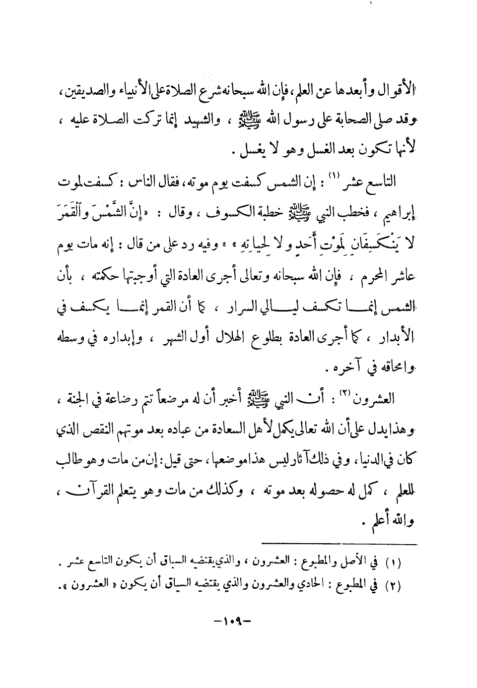 التَّاسِع عشر إِن الشَّمْس كسفت يَوْم مَوته فَقَالَ النَّاس كسفت لمَوْت إِبْرَاهِيم فَخَطب النَّبِي صلى الله عَلَيْهِ وَسلم خطْبَة الْكُسُوف وَقَالَ إِن الشَّمْس وَالْقَمَر لَا ينكسفان لمَوْت أحد وَلَا لِحَيَاتِهِ وَفِيه رد على من قَالَ إِنَّه مَاتَ يَوْم عَاشر الْمحرم فَإِن الله سُبْحَانَهُ وَتَعَالَى أجْرى الْعَادة الَّتِي أوجبتها حكمته بِأَن الشَّمْس إِنَّمَا تكسف ليَالِي السرَار كَمَا أَن الْقَمَر إِنَّمَا يكسف فِي الأبدار كَمَا أجْرى الْعَادة بِطُلُوع الْهلَال أول الشَّهْر وإبداره فِي وَسطه وامحاقه فِي آخِره