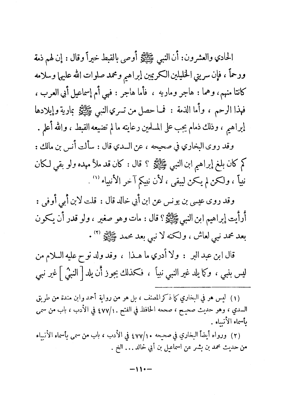 وَقد روى البُخَارِيّ فِي صَحِيحه عَن السّديّ قَالَ سَالَتْ انس بن مَالك كم كَانَ بلغ إِبْرَاهِيم ابْن النَّبِي صلى الله عَلَيْهِ وَسلم قَالَ كَانَ قد مَلأ مهده وَلَو بَقِي لَكَانَ نَبيا وَلَكِن لم يكن ليبقى لِأَن نَبِيكُم آخر الْأَنْبِيَاء