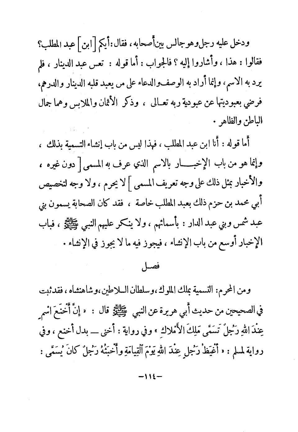 أما قَوْله أَنا ابْن عبد الْمطلب فَهَذَا لَيْسَ من بَاب إنْشَاء التَّسْمِيَة بذلك وَإِنَّمَا هُوَ بَاب الْإِخْبَار بِالِاسْمِ الَّذِي عرف بِهِ الْمُسَمّى دون غَيره وَالْأَخْبَار بِمثل ذَلِك على وَجه تَعْرِيف الْمُسَمّى لَا يحرم وَلَا وَجه لتخصيص أبي مُحَمَّد بن حزم ذَلِك بِعَبْد الْمطلب خَاصَّة فقد كَانَ الصَّحَابَة يسمون بني عبد شمس وَبني عبد الدَّار بِأَسْمَائِهِمْ وَلَا يُنكر عَلَيْهِم النَّبِي صلى الله عَلَيْهِ وَسلم فباب الْإِخْبَار أوسع من بَاب الْإِنْشَاء فَيجوز مَا لَا يجوز فِي الْإِنْشَاء