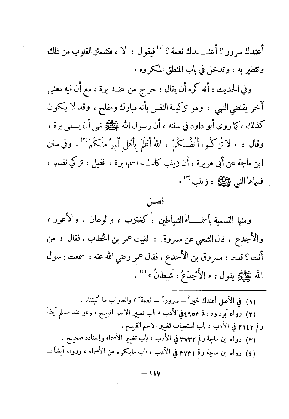 وَمِنْهَا التَّسْمِيَة بأسماء الشَّيَاطِين كخنزب والولهان والأعور والأجدع قَالَ الشّعبِيّ عَن مَسْرُوق لقِيت عمر بن الْخطاب فَقَالَ من أَنْت قلت مَسْرُوق بن الأجدع فَقَالَ عمر رَضِي الله عَنهُ سَمِعت رَسُول الله صلى الله عَلَيْهِ وَسلم يَقُول الأجدع شَيْطَان