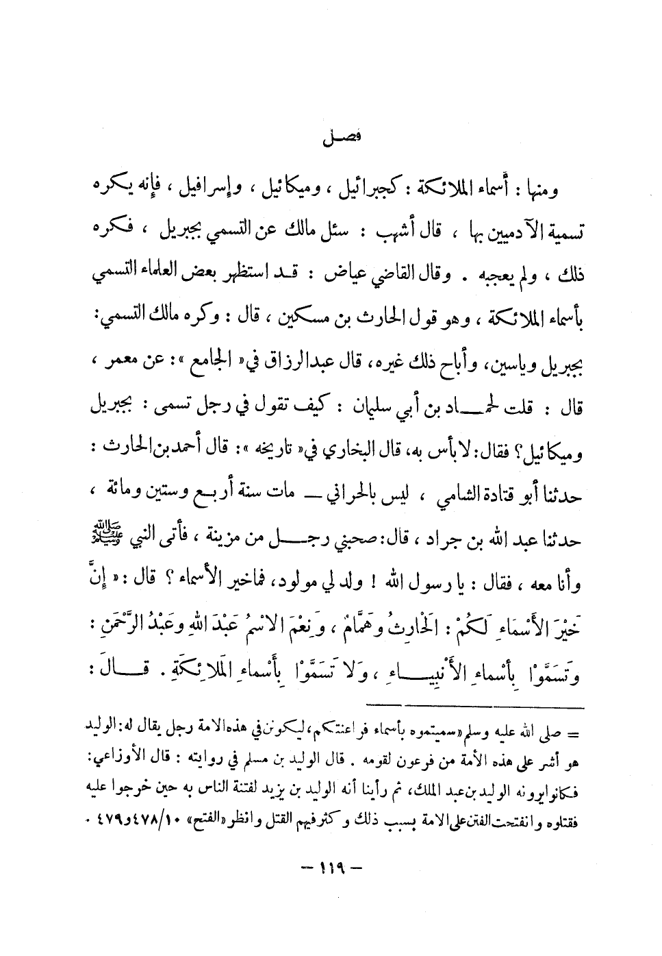 وَمِنْهَا كأسماء الْمَلَائِكَة كجبرائيل وَمِيكَائِيل وإسرافيل فَإِنَّهُ يكره تَسْمِيَة الْآدَمِيّين بهَا قَالَ أَشهب سُئِلَ مَالك عَن التسمي بِجِبْرِيل فكره ذَلِك وَلم يُعجبهُ وَقَالَ القَاضِي عِيَاض قد استظهر بعض الْعلمَاء التسمي بأسماء الْمَلَائِكَة وَهُوَ قَول الْحَارِث بن مِسْكين قَالَ وَكره مَالك التسمي بِجِبْرِيل وَيَاسِين وأباح ذَلِك غَيره قَالَ عبد الرَّزَّاق فِي الْجَامِع عَن معمر قَالَ قلت لحماد بن أبي سُلَيْمَان كَيفَ تَقول فِي رجل تسمى بِجِبْرِيل وَمِيكَائِيل فَقَالَ لَا بَأْس بِهِ قَالَ البُخَارِيّ فِي تَارِيخه قَالَ أَحْمد بن الْحَارِث حَدثنَا أَبُو قَتَادَة الشَّامي لَيْسَ بالحراني مَاتَ سنة أَربع وَسِتِّينَ وَمِائَة حَدثنَا عبد الله بن جَراد قَالَ صحبني رجل من مزينة فَأتى النَّبِي صلى الله عَلَيْهِ وَسلم وَأَنا مَعَه فَقَالَ يَا رَسُول الله ولد لي مَوْلُود فَمَا خير الْأَسْمَاء قَالَ إِن خير الْأَسْمَاء لكم الْحَارِث وَهَمَّام وَنعم الِاسْم عبد الله وَعبد الرَّحْمَن وتسموا بأسماء الْأَنْبِيَاء وَلَا تسموا بأسماء الْمَلَائِكَة قَالَ