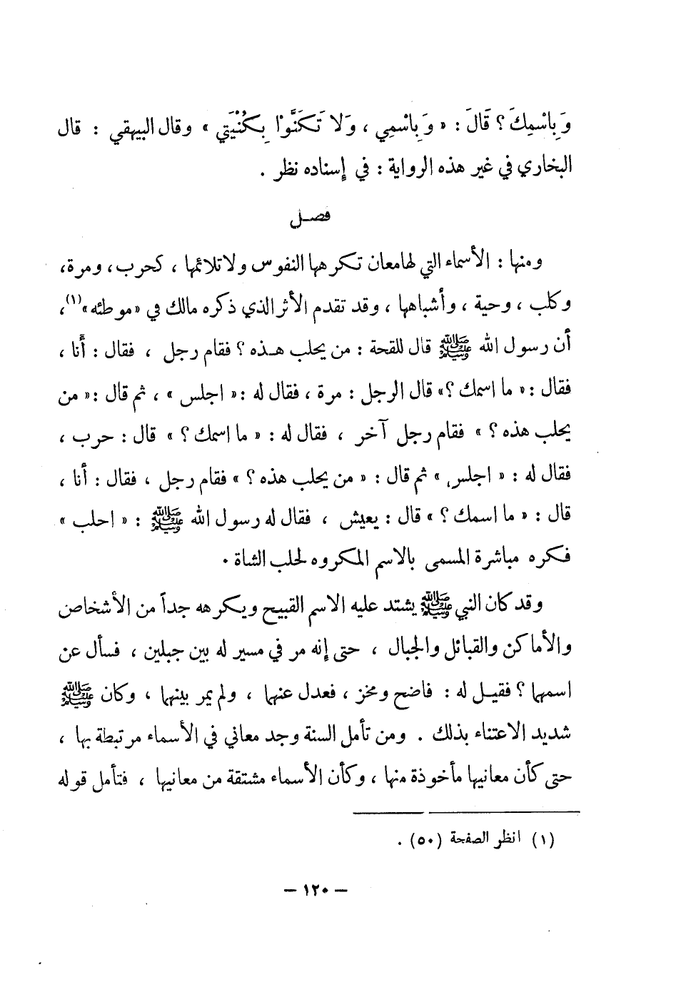 وَمِنْهَا الْأَسْمَاء الَّتِي لَهَا معَان تكرهها النُّفُوس وَلَا تلائمها كحرب وَمرَّة وكلب وحية وأشبهاهها وَقد تقدم الْأَثر الَّذِي ذكره مَالك فِي موطئِهِ أَن رَسُول الله صلى الله عَلَيْهِ وَسلم قَالَ للقحة من يحلب هَذِه فَقَامَ رجل فَقَالَ أَنا فَقَالَ مَا اسْمك قَالَ الرجل مرّة فَقَالَ لَهُ اجْلِسْ ثمَّ قَالَ من يحلب هَذِه فَقَامَ رجل آخر فَقَالَ لَهُ مَا اسْمك قَالَ حَرْب فَقَالَ لَهُ اجْلِسْ ثمَّ قَالَ من يحلب هَذِه فَقَامَ رجل فَقَالَ أَنا قَالَ مَا اسْمك قَالَ يعِيش فَقَالَ لَهُ رَسُول الله صلى الله عَلَيْهِ وَسلم احلب فكره مُبَاشرَة الْمُسَمّى بِالِاسْمِ الْمَكْرُوه لحلب الشَّاة