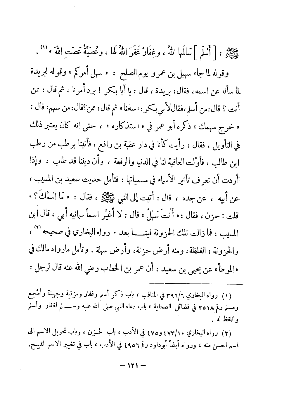 وَقَوله لما جَاءَ سُهَيْل بن عَمْرو يَوْم الصُّلْح سهل أَمركُم وَقَوله لبريدة لما سَأَلَهُ عَن اسْمه فَقَالَ بُرَيْدَة قَالَ يَا أَبَا بكر برد أمرنَا ثمَّ قَالَ مِمَّن أَنْت قَالَ من أسلم فَقَالَ لأبي بكر سلمنَا ثمَّ قَالَ مِمَّن قَالَ من سهم قَالَ خرج سهمك ذكره أَبُو عمر فِي استذكاره حَتَّى انه كَانَ يعْتَبر ذَلِك فِي التَّأْوِيل فَقَالَ رَأَيْت كأنا فِي دَار عقبَة بن رَافع فأتينا برطب من رطب ابْن طَالب فأولت الْعَاقِبَة لنا فِي الدُّنْيَا والرفعة وَأَن ديننَا قد طَابَ وَإِذا أردْت أَن تعرف تَأْثِير الْأَسْمَاء فِي مسمياتها فَتَأمل حَدِيث سعيد بن الْمسيب عَن أَبِيه عَن جده قَالَ أتيت إِلَى النَّبِي صلى الله عَلَيْهِ وَسلم فَقَالَ مَا اسْمك قلت حزن فَقَالَ أَنْت سهل قَالَ لَا أغير اسْما سمانيه أبي قَالَ ابْن الْمسيب فَمَا زَالَت تِلْكَ الحزونة فِينَا بعد رَوَاهُ البُخَارِيّ فِي صَحِيحه والحزونة الغلظة وَمِنْه أَرض حزنة وَأَرْض سهلة وَتَأمل مَا رَوَاهُ مَالك فِي الْمُوَطَّأ عَن يحيى بن سعيد أَن عمر بن الْخطاب رَضِي الله عَنهُ قَالَ لرجل