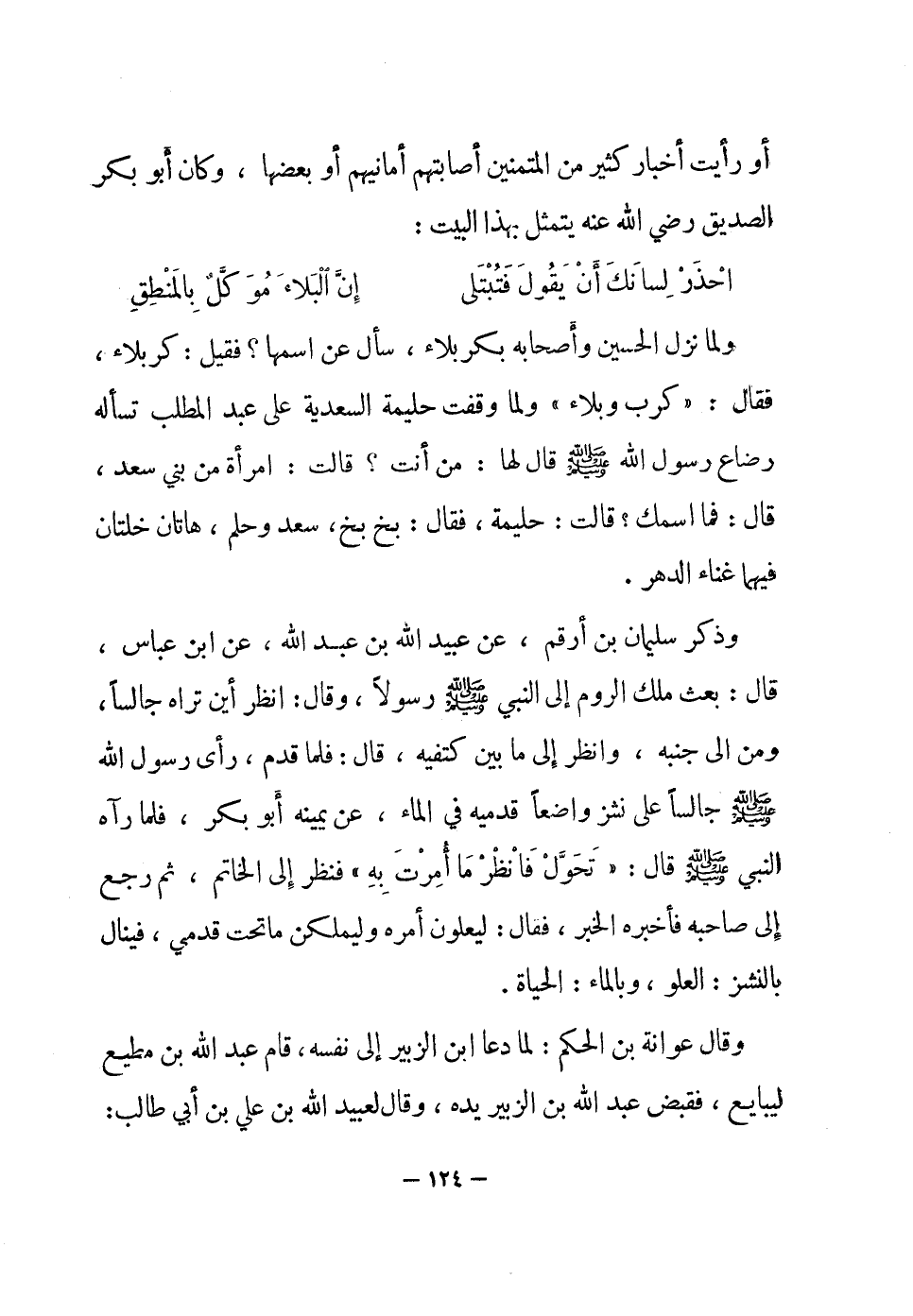 وَذكر سُلَيْمَان بن أَرقم عَن عبيد الله بن عبد الله عَن ابْن عَبَّاس قَالَ بعث ملك الرّوم إِلَى النَّبِي صلى الله عَلَيْهِ وَسلم رَسُولا وَقَالَ انْظُر أَيْن ترَاهُ جَالِسا وَمن إِلَى جنبه وَانْظُر إِلَى مَا بَين كَتفيهِ قَالَ فَلَمَّا قدم رأى رَسُول الله صلى الله عَلَيْهِ وَسلم جَالِسا على نشز وَاضِعا قَدَمَيْهِ فِي المَاء عَن يَمِينه أَبُو بكر فَلَمَّا رَآهُ النَّبِي صلى الله عَلَيْهِ وَسلم قَالَ تحول فَانْظُر مَا أمرت بِهِ فَنظر إِلَى الْخَاتم ثمَّ رَجَعَ إِلَى صَاحبه فَأخْبرهُ الْخَبَر فَقَالَ ليعلمون أمره وليملكن مَا تَحت قدمي فينال بالنشز الْعُلُوّ وبالماء الْحَيَاة