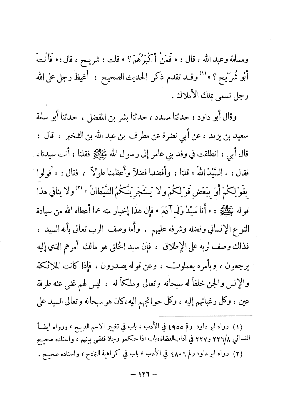وَقَالَ أَبُو دَاوُد حَدثنَا مُسَدّد حَدثنَا بشر بن الْمفضل حَدثنَا أَبُو سَلمَة سعيد بن يزِيد عَن أبي نَضرة عَن مطرف بن عبد الله بن الشخير قَالَ قَالَ أبي انْطَلَقت فِي وَفد بني عَامر إِلَى رَسُول الله صلى الله عَلَيْهِ وَسلم فَقُلْنَا أَنْت سيدنَا فَقَالَ السَّيِّد الله قُلْنَا وأفضلنا فضلا وأعظمنا طولا فَقَالَ قُولُوا بقولكم أَو بِبَعْض قَوْلكُم وَلَا يستجرينكم الشَّيْطَان وَلَا يُنَافِي هَذَا قَوْله صلى الله عَلَيْهِ وَسلم أَنا سيد ولد آدم فَإِن هَذَا إِخْبَار مِنْهُ عَمَّا أعطَاهُ الله من سيادة النَّوْع الإنساني وفضله وشرفه عَلَيْهِم وَأما وصف الرب تَعَالَى بِأَنَّهُ السَّيِّد فَذَلِك وصف لرَبه على الْإِطْلَاق فَإِن سيد الْخلق هُوَ مَالك أَمرهم الَّذِي إِلَيْهِ يرجعُونَ وبأمره يعلمُونَ وَعَن قَوْله يصدرون فَإِذا كَانَت الْمَلَائِكَة وَالْإِنْس وَالْجِنّ خلقا لَهُ سُبْحَانَهُ وَتَعَالَى وملكا لَهُ لَيْسَ لَهُم غنى عَنهُ طرفَة عين وكل رغباتهم إِلَيْهِ وكل حوائجهم اليه كَانَ هُوَ سُبْحَانَهُ وَتَعَالَى السَّيِّد على