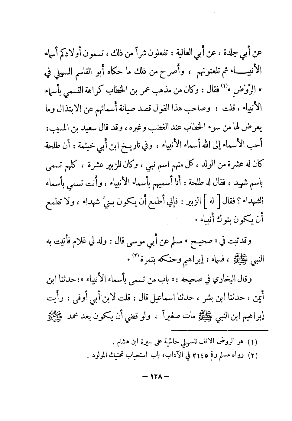 عَن أبي جلدَة عَن أبي الْعَالِيَة تَفْعَلُونَ شرا من ذَلِك تسمون أَوْلَادكُم أَسمَاء الْأَنْبِيَاء ثمَّ تلعنونهم وأصرح من ذَلِك مَا حَكَاهُ أَبُو الْقَاسِم السُّهيْلي فِي الرَّوْض فَقَالَ وَكَانَ من مَذْهَب عمر بن الْخطاب كَرَاهَة التسمي بأسماء الْأَنْبِيَاء قلت وَصَاحب هَذَا القَوْل قصد صِيَانة أسمائهم عَن الابتذال وَمَا يعرض لَهَا من سوء الْخطاب عِنْد الْغَضَب وَغَيره وَقد قَالَ سعيد بن الْمسيب أحب الْأَسْمَاء إِلَى الله أَسمَاء الْأَنْبِيَاء وَفِي تَارِيخ ابْن أبي خَيْثَمَة أَن طَلْحَة كَانَ لَهُ عشرَة من الْوَلَد كل مِنْهُم اسْم نَبِي وَكَانَ للزبير عشرَة كلهم تسمى باسم شَهِيد فَقَالَ لَهُ طَلْحَة أَنا أسميهم بأسماء الْأَنْبِيَاء وَأَنت تسمي بأسماء الشُّهَدَاء فَقَالَ لَهُ الزبير فَإِنِّي أطمع أَن يكون بني شُهَدَاء وَلَا تطمع أَن يكون بنوك أَنْبيَاء