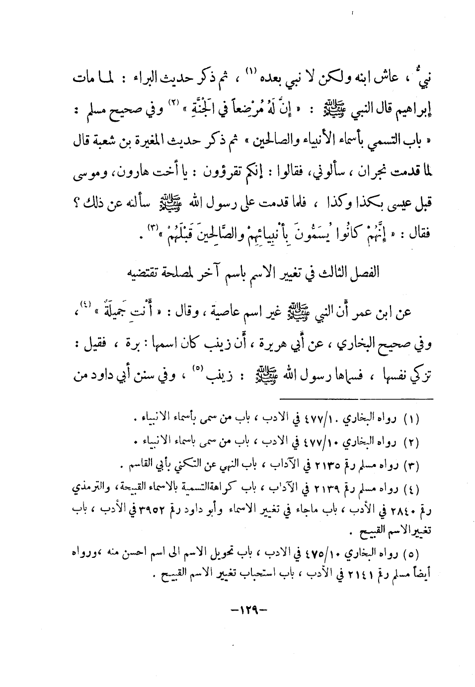 عَن ابْن عمر أَن النَّبِي صلى الله عَلَيْهِ وَسلم غير اسْم عاصية وَقَالَ أَنْت جميلَة وَفِي صَحِيح البُخَارِيّ عَن أبي هُرَيْرَة أَن زَيْنَب كَانَ اسْمهَا برة فَقيل تزكي نَفسهَا فسماها رَسُول الله صلى الله عَلَيْهِ وَسلم زَيْنَب وَفِي سنَن أبي دَاوُد من