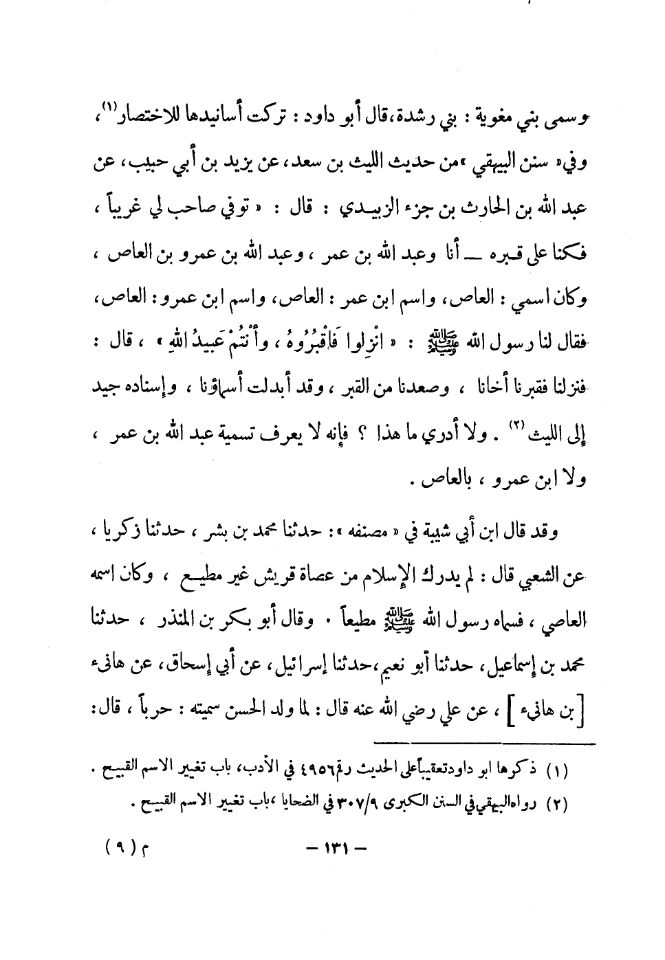 وَسمي بني مغوية بني رشدة قَالَ أَبُو دَاوُد تركت أسانيدها للاختصار وَفِي سنَن الْبَيْهَقِيّ من حَدِيث اللَّيْث بن سعيد عَن يزِيد بن أبي حبيب عَن عبد الله بن الْحَارِث بن جُزْء الزبيدِيّ قَالَ توفّي صَاحب لي غَرِيبا فَكُنَّا على قَبره أَنا وَعبد الله بن عمر وَعبد الله بن عَمْرو بن الْعَاصِ وَكَانَ اسْمِي الْعَاصِ وَاسم ابْن عمر الْعَاصِ وَاسم ابْن عَمْرو الْعَاصِ فَقَالَ لنا رَسُول الله صلى الله عَلَيْهِ وَسلم انزلوا فاقبروه وَأَنْتُم عبيد الله قَالَ فنزلنا فقبرنا أخانا وصعدنا من الْقَبْر وَقد أبدلت أسماؤنا // وَإِسْنَاده جيد إِلَى اللَّيْث وَلَا أَدْرِي مَا هَذَا فَإِنَّهُ لَا يعرف تَسْمِيَة عبد الله بن عمر وَلَا ابْن عَمْرو بالعاص