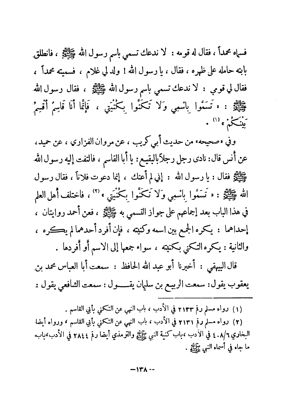 وَفِي صَحِيحه من حَدِيث أبي كريب عَن مَرْوَان الْفَزارِيّ عَن حميد عَن أنس قَالَ نَادَى رجل رجلا بِالبَقِيعِ يَا أَبَا الْقَاسِم فَالْتَفت إِلَيْهِ رَسُول الله صلى الله عَلَيْهِ وَسلم فَقَالَ يَا رَسُول الله إِنِّي لم أعنك إِنَّمَا دَعَوْت فلَانا فَقَالَ رَسُول الله صلى الله عَلَيْهِ وَسلم تسموا باسمي وَلَا تكنوا بكنيتي فَاخْتلف أهل الْعلم فِي هَذَا الْبَاب بعد أجماعهم على جَوَاز التسمي بِهِ صلى الله عَلَيْهِ وَسلم فَعَن أَحْمد رِوَايَتَانِ إِحْدَاهمَا يكره الْجمع بَين اسْمه وكنيته فَإِن أفرد أَحدهمَا لم يكره وَالثَّانيَِة يكره التكني بكنيته سَوَاء جمعهَا إِلَى الِاسْم أَو أفرادها