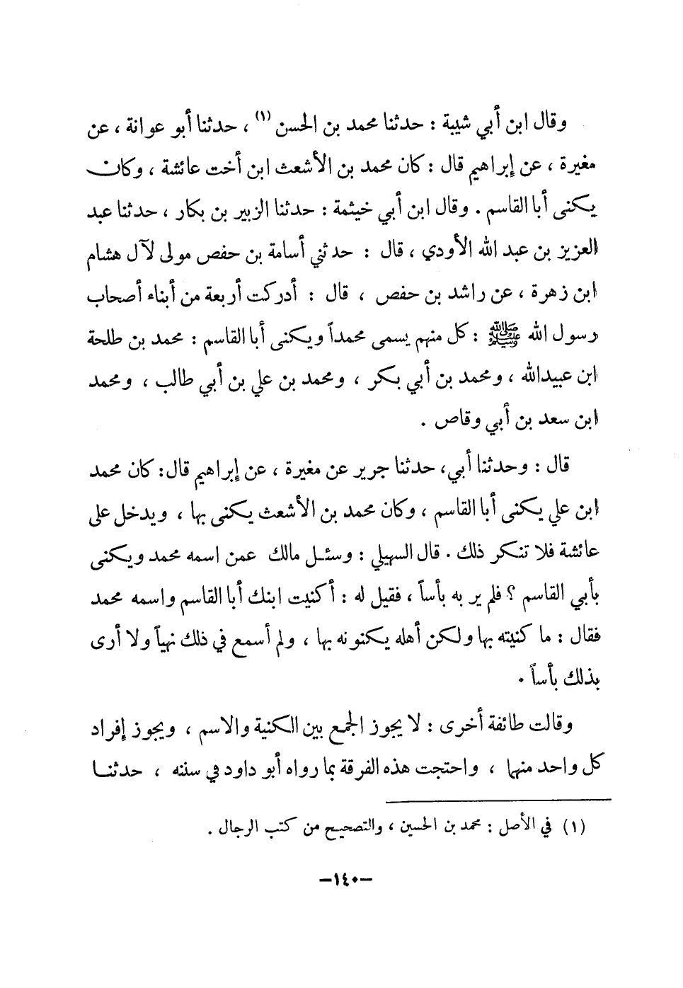 قَالَ وَحدثنَا أبي حَدثنَا جرير عَن مُغيرَة عَن إِبْرَاهِيم قَالَ كَانَ مُحَمَّد ابْن عَليّ يكنى أَبَا الْقَاسِم وَكَانَ مُحَمَّد بن الْأَشْعَث يكنى بهَا وَيدخل على عَائِشَة فَلَا تنكر ذَلِك قَالَ السُّهيْلي وَسُئِلَ مَالك عَمَّن اسْمه مُحَمَّد ويكنى بِأبي الْقَاسِم فَلم ير بِهِ بَأْسا فَقيل لَهُ أكنيت ابْنك أَبَا الْقَاسِم واسْمه مُحَمَّد فَقَالَ مَا كنيته بهَا وَلَكِن أَهله يكنونه بهَا وَلم أسمع فِي ذَلِك نهيا وَلَا أرى بذلك بَأْسا