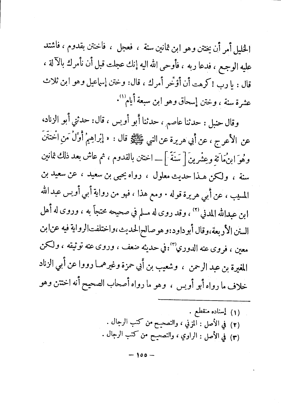 وَقَالَ حَنْبَل حَدثنَا عَاصِم حَدثنَا أَبُو أويس قَالَ حَدثنِي أَبُو الزِّنَاد عَن الْأَعْرَج عَن أبي هُرَيْرَة عَن النَّبِي صلى الله عَلَيْهِ وَسلم قَالَ إِبْرَاهِيم أول من اختتن وَهُوَ ابْن مائَة وَعشْرين سنة اختتن بالقدوم ثمَّ عَاشَ بعد ذَلِك ثَمَانِينَ سنة وَلَكِن هَذَا حَدِيث مَعْلُول رَوَاهُ يحيى بن سعيد عَن سعيد بن الْمسيب عَن أبي هُرَيْرَة قَوْله وَمَعَ هَذَا فَهُوَ من رِوَايَة أبي أويس عبد الله ابْن عبد الله الْمدنِي وَقد روى لَهُ مُسلم فِي صَحِيحه محتجا بِهِ وروى لَهُ أهل السّنَن الْأَرْبَعَة وَقَالَ أَبُو دَاوُد وَهُوَ صَالح الحَدِيث وَاخْتلفت الرِّوَايَة فِيهِ عَن ابْن معِين فروى عَنهُ الدوري فِي حَدِيثه ضعف وروى عَنهُ توثيقه وَلَكِن الْمُغيرَة بن عبد الرَّحْمَن وَشُعَيْب بن أبي حَمْزَة وَغَيرهمَا رووا عَن أبي الزِّنَاد خلاف مَا رَوَاهُ أَبُو أويس وَهُوَ مَا رَوَاهُ أَصْحَاب الصَّحِيح أَنه اختتن وَهُوَ