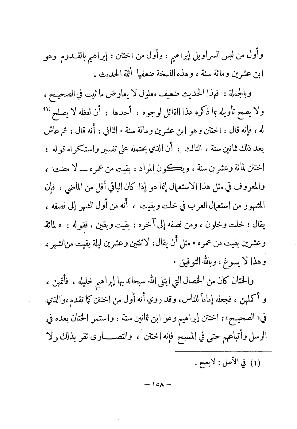 وَبِالْجُمْلَةِ فَهَذَا الحَدِيث ضَعِيف مَعْلُول لَا يُعَارض مَا ثَبت فِي الصَّحِيح وَلَا يَصح تَأْوِيله بِمَا ذكره هَذَا الْقَائِل لوجوه أَحدهَا أَن لَفظه لَا يصلح لَهُ فَإِنَّهُ قَالَ اختتن وَهُوَ ابْن عشْرين ومائه سنة الثَّانِي أَنه قَالَ ثمَّ عَاشَ بعد ذَلِك ثَمَانِينَ سنة الثَّالِث أَن الَّذِي يحْتَملهُ على تَفْسِير واستكراه قَوْله اختتن لمِائَة وَعشْرين سنة وَيكون المُرَاد بقيت من عمره لَا مَضَت وَالْمَعْرُوف فِي مثل هَذَا الِاسْتِعْمَال إِنَّمَا هُوَ إِذا كَانَ الْبَاقِي أقل من الْمَاضِي فَإِن الْمَشْهُور من اسْتِعْمَال الْعَرَب فِي خلت وَبقيت أَنه من أول الشَّهْر إِلَى نصفه يُقَال خلت وخلون وَمن نصفه إِلَى آخِره بقيت وبقين فَقَوله لمِائَة وَعشْرين بقيت من عمره مثل أَن يُقَال لاثْنَتَيْنِ وَعشْرين لَيْلَة بقيت من الشَّهْر وَهَذَا لَا يسوغ وَبِاللَّهِ التَّوْفِيق