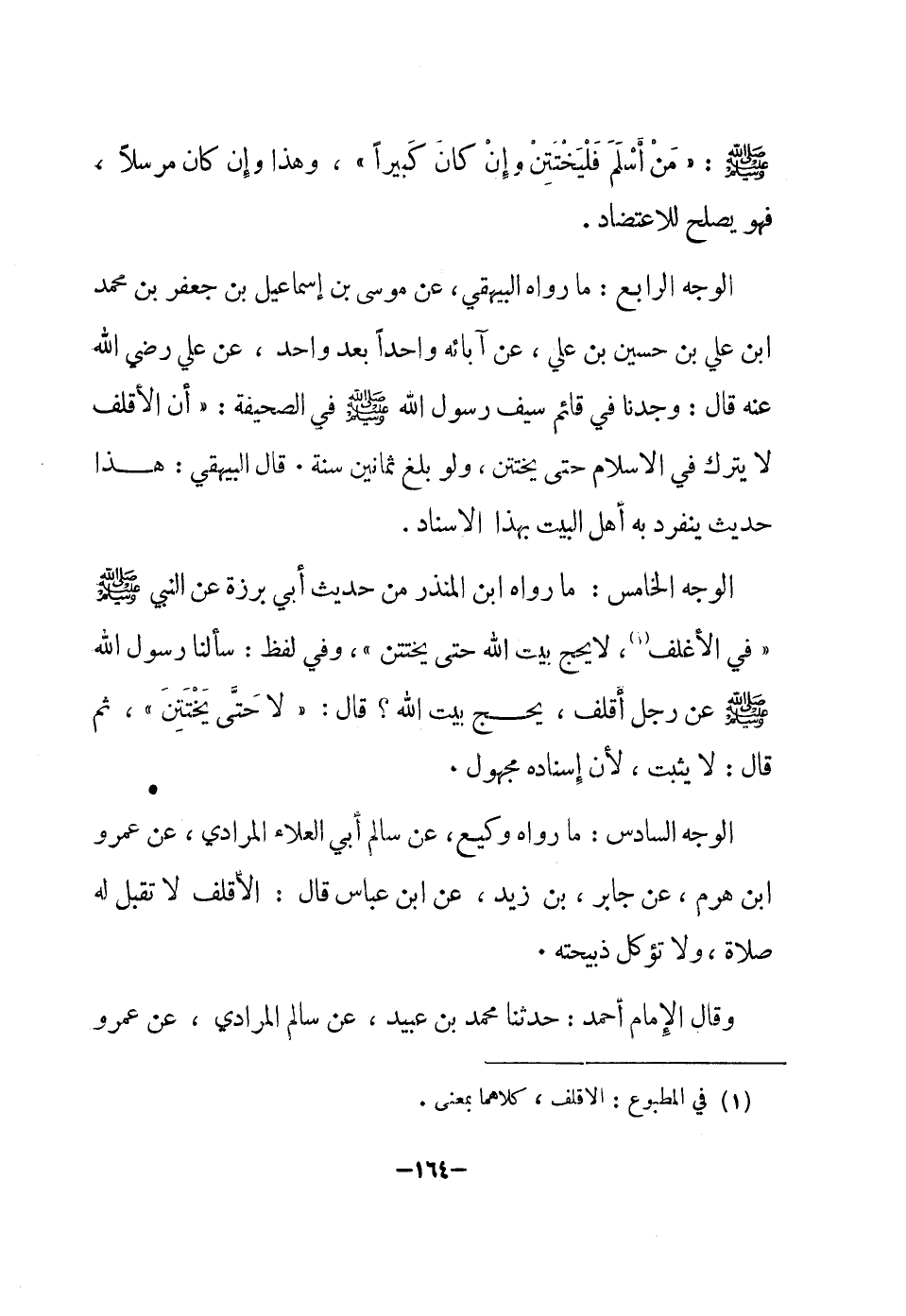 الْوَجْه الرَّابِع مَا رَوَاهُ الْبَيْهَقِيّ عَن مُوسَى بن إِسْمَاعِيل بن جَعْفَر بن مُحَمَّد ابْن عَليّ بن حُسَيْن بن عَليّ عَن آبَائِهِ وَاحِدًا بعد وَاحِد عَن عَليّ رَضِي الله عَنهُ قَالَ وجدنَا فِي قَائِم سيف رَسُول الله صلى الله عَلَيْهِ وَسلم فِي الصَّحِيفَة أَن الأقلف لَا يتْرك فِي الاسلام حَتَّى يختتن وَلَو بلغ ثَمَانِينَ سنة قَالَ الْبَيْهَقِيّ هَذَا حَدِيث ينْفَرد بِهِ أهل الْبَيْت بِهَذَا الاسناد