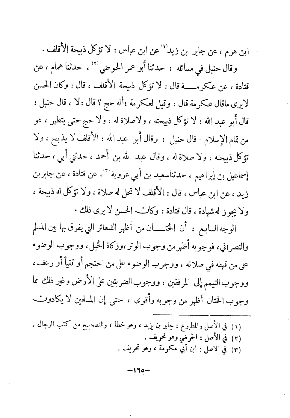 وَقَالَ حَنْبَل فِي مسائلة حَدثنَا أَبُو عمر الحوضي حَدثنَا همام عَن قَتَادَة عَن عِكْرِمَة قَالَ لَا تُؤْكَل ذَبِيحَة الأقلف قَالَ وَكَانَ الْحسن لَا يرى مَا قَالَ عِكْرِمَة قَالَ وَقيل لعكرمة أَله حج قَالَ لَا قَالَ حَنْبَل قَالَ أَبُو عبد الله لَا تُؤْكَل ذَبِيحَته وَلَا صَلَاة لَهُ وَلَا حج حَتَّى يطهر وَهُوَ من تَمام الْإِسْلَام قَالَ حَنْبَل وَقَالَ أَبُو عبد الله الأقلف لَا يذبح وَلَا تُؤْكَل ذَبِيحَته وَلَا صَلَاة لَهُ وَقَالَ عبد الله بن أَحْمد حَدثنِي أبي حَدثنَا إِسْمَاعِيل بن إِبْرَاهِيم حَدثنَا سعيد بن أبي عرُوبَة عَن قَتَادَة عَن جَابر بن زيد عَن ابْن عَبَّاس قَالَ الأقلف لَا تحل لَهُ صَلَاة وَلَا تُؤْكَل لَهُ ذَبِيحَة وَلَا يجوز لَهُ الشَّهَادَة قَالَ قَتَادَة وَكَانَ الْحسن لَا يرى ذَلِك