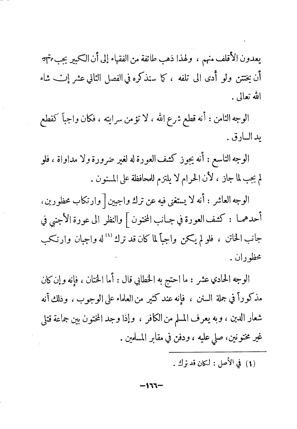 يعدون الأقلف مِنْهُم وَلِهَذَا ذهب طَائِفَة من الْفُقَهَاء إِلَى أَن تَكْبِير يجب عَلَيْهِ أَن يختتن وَلَو أدّى الى تلفة كَمَا سَنذكرُهُ فِي الْفَصْل الثَّانِي عشر إِن شَاءَ الله تَعَالَى