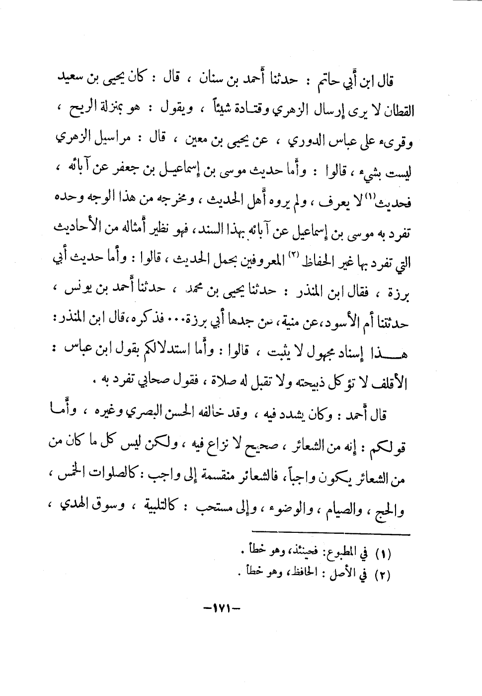 قَالَ ابْن أبي حَاتِم حَدثنَا أَحْمد بن سِنَان قَالَ مَكَان يحيى بن سعيد الْقطَّان لَا يرى إرْسَال الزُّهْرِيّ وَقَتَادَة شَيْئا وَيَقُول هُوَ بِمَنْزِلَة الرّيح وقرىء على عَبَّاس الدوري عَن يحيى بن معِين قَالَ مَرَاسِيل الزُّهْرِيّ لَيست بِشَيْء قَالُوا وَأما حَدِيث مُوسَى بن إِسْمَاعِيل بن جَعْفَر عَن آبَائِهِ فَحَدِيث لَا يعرف وَلم يروه أهل الحَدِيث ومخرجه من هَذَا الْوَجْه وَحده تفرد بِهِ مُوسَى بن إِسْمَاعِيل عَن آبَائِهِ بِهَذَا السَّنَد فَهُوَ نَظِير أَمْثَاله من الْأَحَادِيث الَّتِي تفرد بهَا غير الْحفاظ المعروفين بِحمْل الحَدِيث قَالُوا وَأما حَدِيث أبي بَرزَة فَقَالَ ابْن الْمُنْذر حَدثنَا يحيى بن مُحَمَّد حَدثنَا أَحْمد بن يُونُس حَدَّثتنَا أم الْأسود عَن منية عَن جدها أبي بَرزَة فَذكره قَالَ ابْن الْمُنْذر هَذَا إِسْنَاد مَجْهُول لَا يثبت قَالُوا وَأما استدلالكم بقول ابْن عَبَّاس الأقلف لَا تُؤْكَل ذَبِيحَته وَلَا تقبل لَهُ صَلَاة فَقَوْل صَحَابِيّ تفرد بِهِ