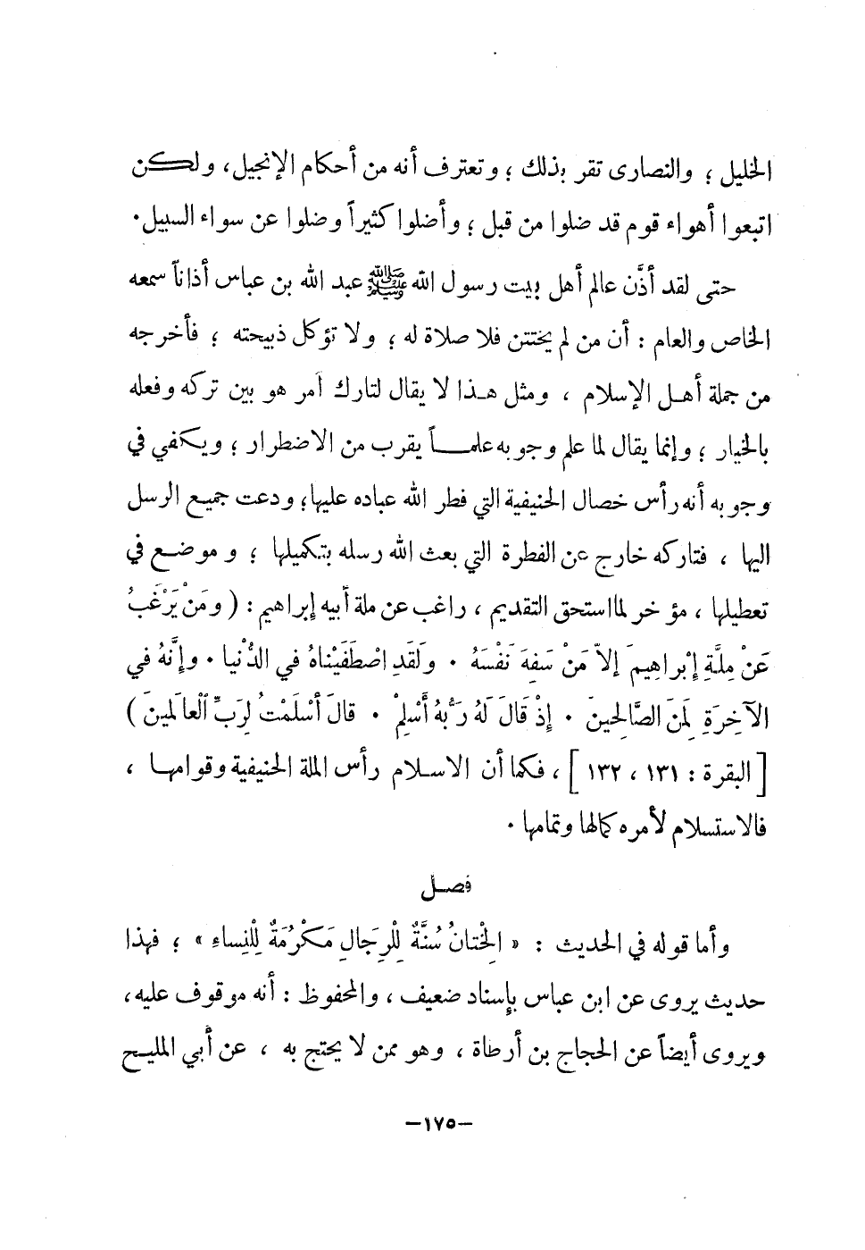 حَتَّى لقد أذن عَالم أهل بَيت رَسُول الله صلى الله عَلَيْهِ وَسلم عبد الله بن عَبَّاس أذانا سَمعه الْخَاص وَالْعَام أَن من لم يختتن فَلَا صَلَاة لَهُ وَلَا تُؤْكَل ذَبِيحَته فَأخْرجهُ من جملَة أهل الْإِسْلَام وَمثل هَذَا لَا يُقَال لتارك أَمر هُوَ بَين تَركه وَفعله بِالْخِيَارِ وَإِنَّمَا يُقَال لما علم وُجُوبه علما يقرب من الِاضْطِرَار وَيَكْفِي فِي وُجُوبه أَنه رَأس خِصَال الحنيفية الَّتِي فطر الله عباده عَلَيْهَا ودعت جَمِيع الرُّسُل إِلَيْهَا فتاركه خَارج عَن الْفطْرَة الَّتِي بعث الله رسله بتكميلها وَمَوْضِع فِي تعطيلها مُؤخر لما اسْتحق التَّقْدِيم رَاغِب فِي مِلَّة أَبِيه إِبْرَاهِيم {وَمن يرغب عَن مِلَّة إِبْرَاهِيم إِلَّا من سفه نَفسه وَلَقَد اصطفيناه فِي الدُّنْيَا وَإنَّهُ فِي الْآخِرَة لمن الصَّالِحين إِذْ قَالَ لَهُ ربه أسلم قَالَ أسلمت لرب الْعَالمين} الْبَقَرَة 131 - 132 فَكَمَا أَن الْإِسْلَام رَأس الْملَّة الحنيفية وقوامها فالاستسلام لأَمره كمالها وتمامها