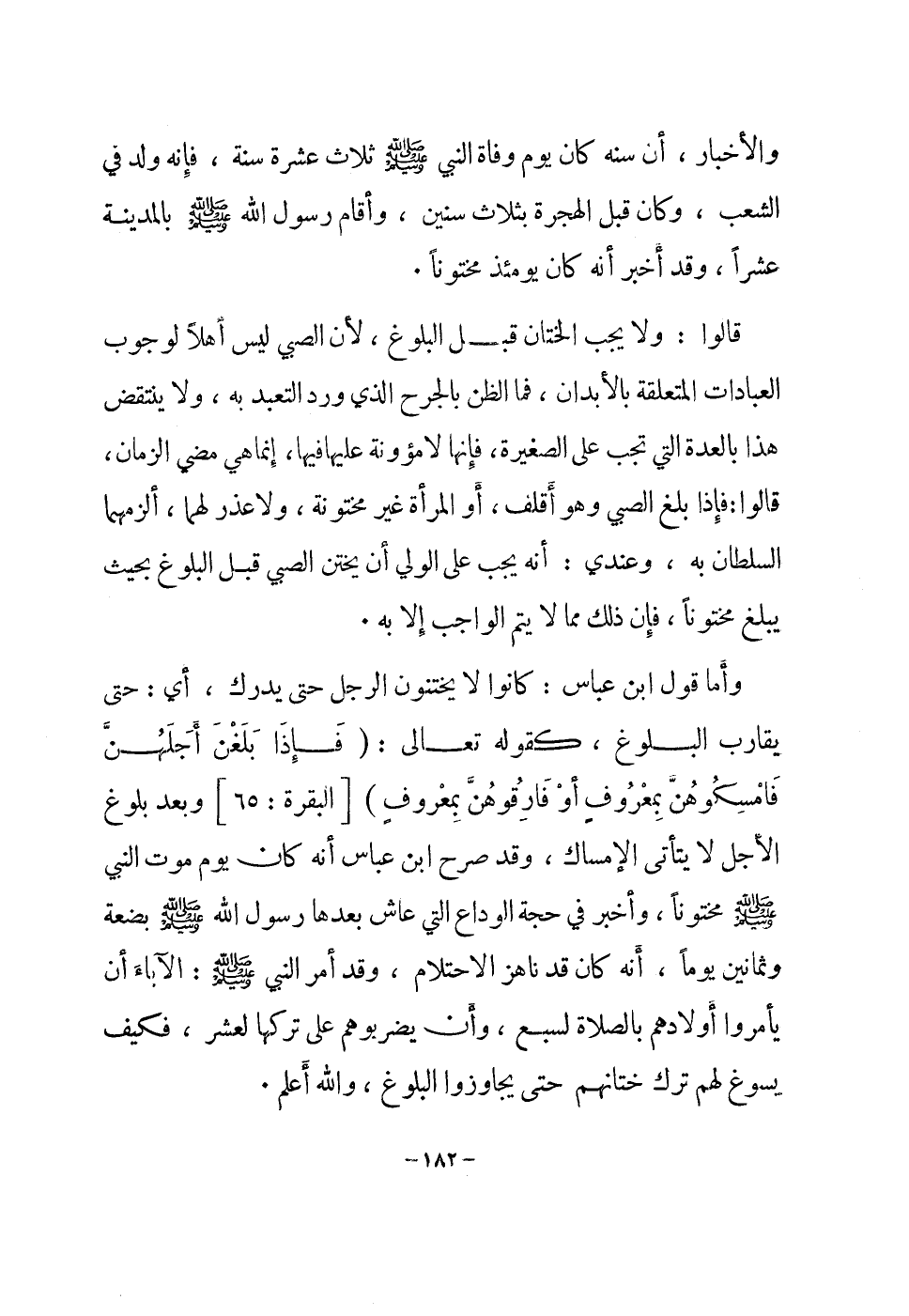 وَأما قَول ابْن عَبَّاس كَانُوا لَا يختنون الرجل حَتَّى يدْرك أَي حَتَّى يُقَارب الْبلُوغ كَقَوْلِه تَعَالَى {فَإِذا بلغن أَجلهنَّ فأمسكوهن بِمَعْرُوف أَو فارقوهن بِمَعْرُوف} الْبَقَرَة 65 وَبعد بُلُوغ الْأَجَل لَا يَتَأَتَّى الْإِمْسَاك وَقد صرح ابْن عَبَّاس أَنه كَانَ يَوْم موت النَّبِي صلى الله عَلَيْهِ وَسلم مختونا وَأخْبر فِي حجَّة الْوَدَاع الَّتِي عَاشَ بعْدهَا رَسُول الله صلى الله عَلَيْهِ وَسلم بضعَة وَثَمَانِينَ يَوْمًا أَنه كَانَ قد ناهز الِاحْتِلَام وَقد أَمر النَّبِي صلى الله عَلَيْهِ وَسلم الْآبَاء أَن يأمروا أَوْلَادهم بِالصَّلَاةِ لسبع وَأَن يضربوهم على تَركهَا لعشر فَكيف يسوغ لَهُم ترك ختانهم حَتَّى يجاوزوا الْبلُوغ وَالله أعلم