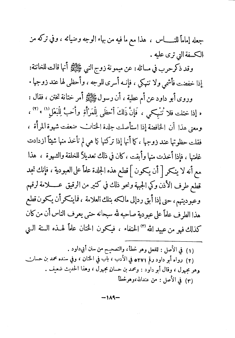 وروى أَبُو دَاوُد عَن أم عَطِيَّة أَن رَسُول الله صلى الله عَلَيْهِ وَسلم أَمر ختانه تختن فَقَالَ إِذا ختنت فَلَا تنهكي فَإِن ذَلِك أحظى للْمَرْأَة وَأحب للبعل وَمعنى هَذَا أَن الخافضة إِذا استأصلت جلدَة الْخِتَان ضعفت شَهْوَة الْمَرْأَة فَقلت حظوتها عِنْد زَوجهَا كَمَا أَنَّهَا إِذا تركتهَا كَمَا هِيَ لم تَأْخُذ مِنْهَا شَيْئا ازدادت غلمتها فَإِذا أخذت مِنْهَا وأبقت كَانَ فِي ذَلِك تعديلا للخلقة والشهوة هَذَا مَعَ أَنه لَا يُنكر أَن يكون قطع هَذِه الْجلْدَة علما على الْعُبُودِيَّة فَإنَّك تَجِد قطع طرف الْأذن وكي الْجَبْهَة وَنَحْو ذَلِك فِي كثير من الرَّقِيق عَلامَة لرقهم وعبوديتهم حَتَّى إِذا أبق رد إِلَى مَالِكه بِتِلْكَ الْعَلامَة فَمَا يُنكر أَن يكون قطع هَذَا الطّرف علما على عبودية صَاحبه لله سُبْحَانَهُ حَتَّى يعرف النَّاس أَن من كَانَ كَذَلِك فَهُوَ من عبيد الله الحنفاء فَيكون الْخِتَان علما لهَذِهِ السّنة الَّتِي