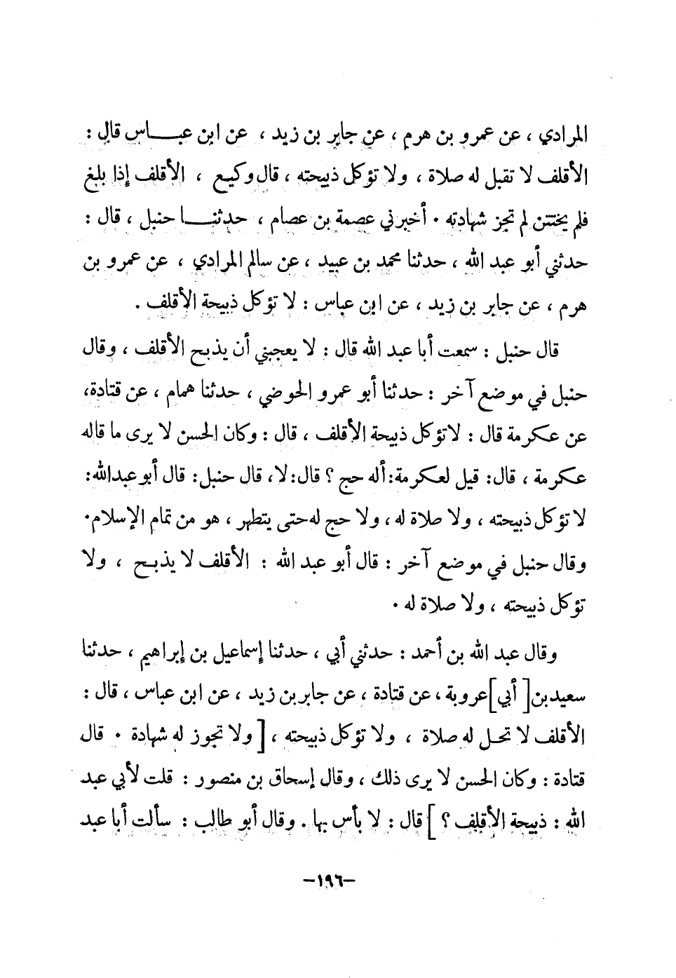 قَالَ حَنْبَل سَمِعت أَبَا عبد الله قَالَ لَا يُعجبنِي أَن يذبح الأقلف وَقَالَ حَنْبَل فِي مَوضِع آخر حَدثنَا أَبُو عَمْرو الحوضي حَدثنَا همام عَن قَتَادَة عَن عِكْرِمَة قَالَ لَا تُؤْكَل ذَبِيحَة الأقلف قَالَ وَكَانَ الْحسن لَا يرى مَا قَالَه عِكْرِمَة قَالَ قيل لعكرمة أَله حج قَالَ لَا قَالَ حَنْبَل قَالَ أَبُو عبد الله لَا تُؤْكَل ذَبِيحَته وَلَا صَلَاة لَهُ وَلَا حج لَهُ حَتَّى يتَطَهَّر هُوَ من تَمام الْإِسْلَام وَقَالَ حَنْبَل فِي مَوضِع آخر قَالَ أَبُو عبد الله الأقلف لَا يذبح وَلَا تُؤْكَل ذَبِيحَته وَلَا صَلَاة لَهُ