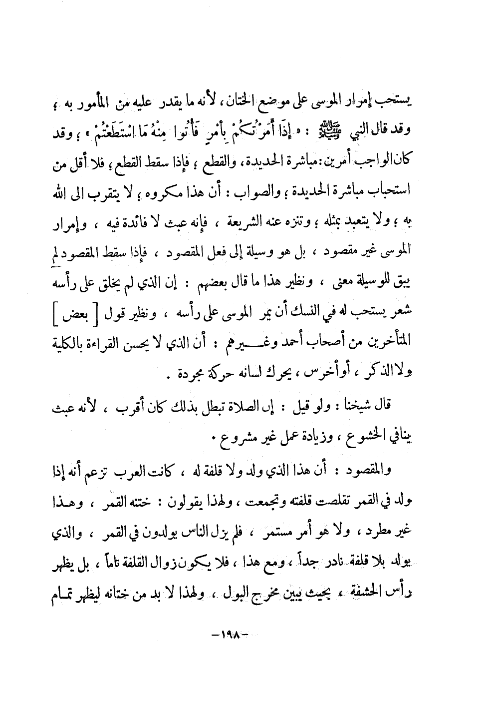 يسْتَحبّ إمرار الموسى على مَوضِع الْخِتَان لِأَنَّهُ مَا يقدر عَلَيْهِ من الْمَأْمُور بِهِ وَقد قَالَ النَّبِي صلى الله عَلَيْهِ وَسلم إِذا أَمرتكُم بِأَمْر فَأتوا مِنْهُ مَا اسْتَطَعْتُم وَقد كَانَ الْوَاجِب أَمريْن مُبَاشرَة الحديدة وَالْقطع فَإِذا سقط الْقطع فَلَا أقل من اسْتِحْبَاب مُبَاشرَة الحديدة وَالصَّوَاب أَن هَذَا مَكْرُوه لَا يتَقرَّب إِلَى الله بِهِ وَلَا يتعبد بِمثلِهِ وتنزه عَنهُ الشَّرِيعَة فَإِنَّهُ عَبث لَا فَائِدَة فِيهِ وإمرار الموسى غير مَقْصُود بل هُوَ وَسِيلَة إِلَى فعل الْمَقْصُود فَإِذا سقط الْمَقْصُود لم يبْق للوسيلة معنى وَنَظِير هَذَا مَا قَالَ بَعضهم إِن الَّذِي يخلق على رَأسه شعر يسْتَحبّ لَهُ فِي النّسك أَن يمر الموسى على رَأسه وَنَظِير قَول بعض الْمُتَأَخِّرين من أَصْحَاب أَحْمد وَغَيرهم أَن الَّذِي لَا يحسن الْقِرَاءَة بِالْكُلِّيَّةِ وَلَا الذّكر أَو أخرس يُحَرك لِسَانه حَرَكَة مُجَرّدَة