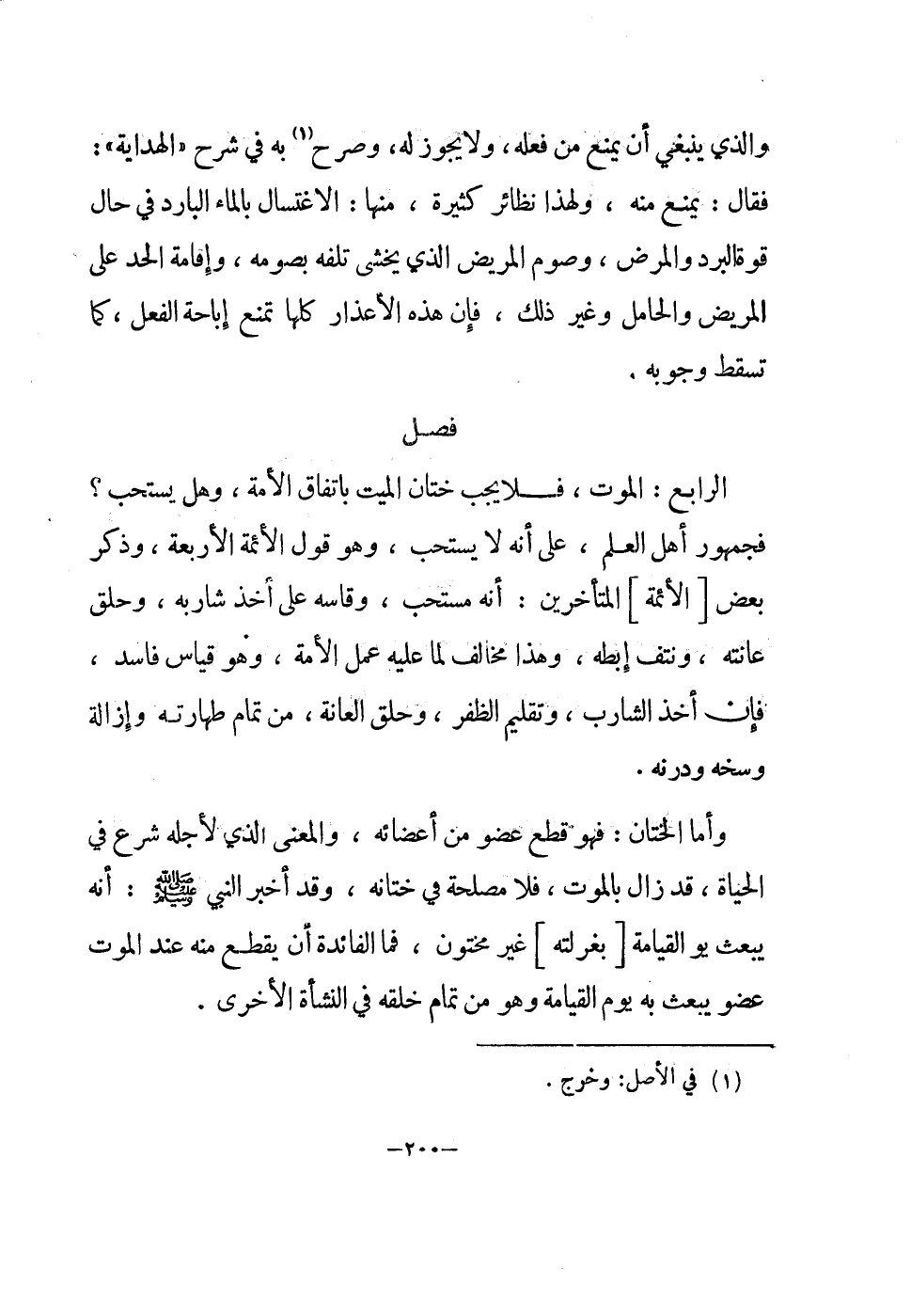 الرَّابِع الْمَوْت فَلَا يجب ختان الْمَيِّت بِاتِّفَاق الْأمة وَهل يسْتَحبّ فجمهور أهل الْعلم على أَنه لَا يسْتَحبّ وَهُوَ قَول الْأَئِمَّة الْأَرْبَعَة وَذكر بعض الْأَئِمَّة الْمُتَأَخِّرين أَنه مُسْتَحبّ وقاسه على أَخذ شَاربه وَحلق عانته ونتف إبطه وَهَذَا مُخَالف لما عَلَيْهِ عمل الْأمة وَهُوَ قِيَاس فَاسد فَإِن أَخذ الشَّارِب وتقليم الظفر وَحلق الْعَانَة من تَمام طَهَارَته وَإِزَالَة وسخه ودرنه