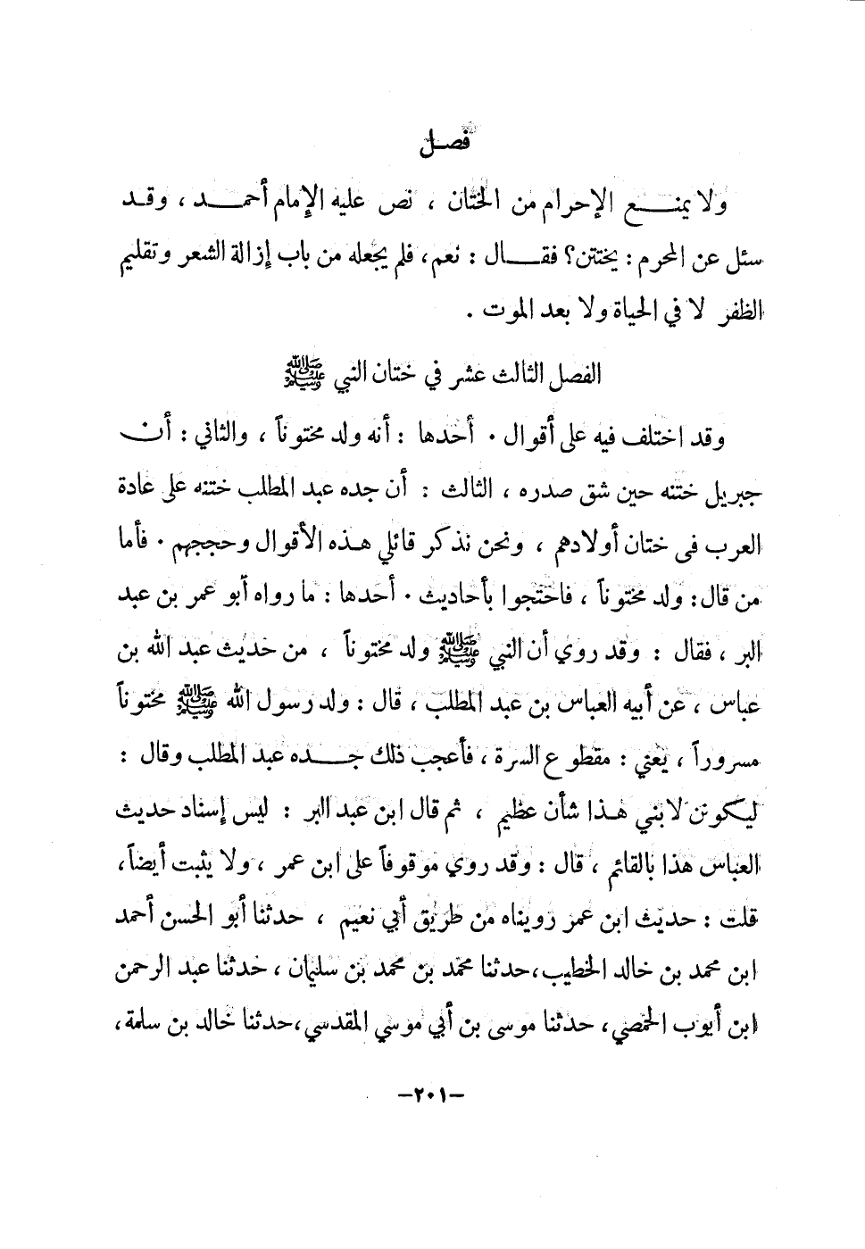 وَقد اخْتلف فِيهِ على أَقْوَال أَحدهَا أَنه ولد مختونا وَالثَّانِي أَن جِبْرِيل ختنه حِين شقّ صَدره الثَّالِث أَن جده عبد الْمطلب ختنه على عَادَة الْعَرَب فِي ختان أَوْلَادهم وَنحن نذْكر قائلي هَذِه الْأَقْوَال وحججهم فَأَما من قَالَ ولد مختونا فاحتجوا بِأَحَادِيث أَحدهَا مَا رَوَاهُ أَبُو عمر بن عبد الْبر فَقَالَ وَقد رُوِيَ أَن النَّبِي صلى الله عَلَيْهِ وَسلم ولد مختونا من حَدِيث عبد الله بن عَبَّاس عَن أَبِيه الْعَبَّاس بن عبد الْمطلب قَالَ ولد رَسُول الله صلى الله عَلَيْهِ وَسلم مختونا مَسْرُورا يَعْنِي مَقْطُوع السُّرَّة فأعجب ذَلِك جده عبد الْمطلب وَقَالَ لَيَكُونن لِابْني هَذَا شَأْن عَظِيم ثمَّ قَالَ ابْن عبد الْبر لَيْسَ إِسْنَاد حَدِيث الْعَبَّاس هَذَا بالقائم قَالَ وَقد رُوِيَ مَوْقُوفا على ابْن عمر وَلَا يثبت أَيْضا قلت حَدِيث ابْن عمر روينَاهُ من طَرِيق أبي نعيم حَدثنَا أَبُو الْحسن أَحْمد ابْن مُحَمَّد بن خَالِد الْخَطِيب حَدثنَا مُحَمَّد بن مُحَمَّد بن سُلَيْمَان حَدثنَا عبد الرَّحْمَن ابْن أَيُّوب الْحِمصِي حَدثنَا مُوسَى بن أبي مُوسَى الْمَقْدِسِي حَدثنَا خَالِد بن سَلمَة