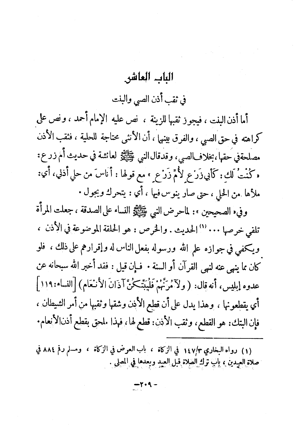 وَفِي الصَّحِيحَيْنِ لما حرض النَّبِي صلى الله عَلَيْهِ وَسلم النِّسَاء على الصَّدَقَة جعلت الْمَرْأَة تلفي خرصها الحَدِيث والخرص هُوَ الْحلقَة الْمَوْضُوعَة فِي الْأذن وَيَكْفِي فِي جَوَازه علم الله وَرَسُوله بِفعل النَّاس لَهُ وإقرارهم على ذَلِك فَلَو كَانَ مِمَّا ينْهَى عَنهُ لنهى الْقُرْآن أَو السّنة فَإِن قيل فقد أخبر الله سُبْحَانَهُ عَن عدوه إِبْلِيس أَنه قَالَ {ولآمرنهم فليبتكن آذان الْأَنْعَام} النِّسَاء 119 أَي يقطعونها وَهَذَا يدل على أَن قطع الْأذن وشقها وثقبها من أَمر الشَّيْطَان فَإِن البتك هُوَ الْقطع وثقب الْأذن قطع لَهَا فَهَذَا مُلْحق بِقطع أذن الْأَنْعَام