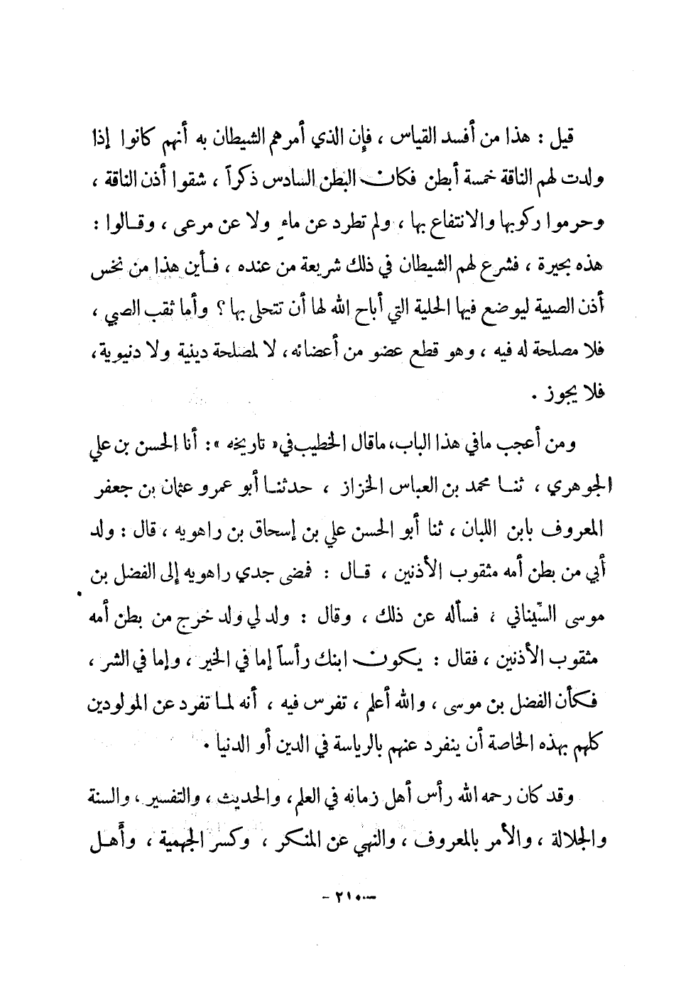 قيل هَذَا من أفسد الْقيَاس فَإِن الَّذِي أَمرهم بِهِ الشَّيْطَان أَنهم كَانُوا إِذا ولدت لَهُم النَّاقة خَمْسَة أبطن فَكَانَ الْبَطن السَّادِس ذكرا شَقوا أذن النَّاقة وحرموا ركُوبهَا وَالِانْتِفَاع بهَا وَلم تطرد عَن مَاء وَلَا عَن مرعى وَقَالُوا هَذِه بحيرة فشرع لَهُم الشَّيْطَان فِي ذَلِك شَرِيعَة من عِنْده فَأَيْنَ هَذَا من نخس أذن الصبية ليوضع فِيهَا الْحِلْية الَّتِي أَبَاحَ الله لَهَا أَن تتحلى بهَا وَأما ثقب الصَّبِي فَلَا مصلحَة لَهُ فِيهِ وَهُوَ قطع عُضْو من أَعْضَائِهِ لَا مصلحَة دينية وَلَا دنيوية فَلَا يجوز