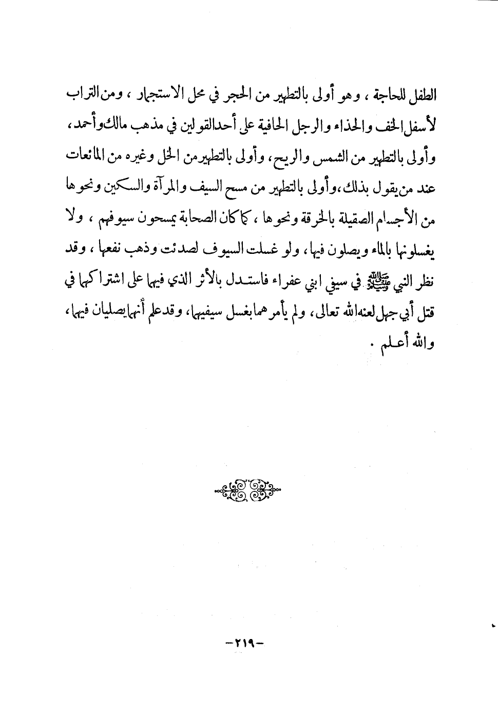 الطِّفْل للْحَاجة وَهُوَ أولى بالتطهير من الْحجر فِي مَحل الِاسْتِجْمَار وَمن التُّرَاب لأسفل الْخُف والحذاء وَالرجل الحافية على أحد الْقَوْلَيْنِ فِي مَذْهَب مَالك وَأحمد وَأولى بالتطهير من الشَّمْس وَالرِّيح وَأولى بالتطهير من الْخلّ وَغَيره من الْمَائِعَات عِنْد من يَقُول بذلك وَأولى بالتطهير من مسح السَّيْف والمرآة والسكين وَنَحْوهَا من الْأَجْسَام الصقيلة بالخرقة وَنَحْوهَا كَمَا كَانَ الصَّحَابَة يمسحون سيوفهم وَلَا يغسلونها بِالْمَاءِ وَيصلونَ فِيهَا وَلَو غسلت السيوف لصدئت وَذهب نَفعهَا وَقد نظر النَّبِي صلى الله عَلَيْهِ وَسلم فِي سَيفي ابْني عفراء فاستدل بالأثر الَّذِي فيهمَا على اشتراكهما فِي قتل أبي جهل لَعنه الله تَعَالَى وَلم يأمرهما بِغسْل سيفيهما وَقد علم أَنَّهُمَا يصليان فيهمَا وَالله أعلم