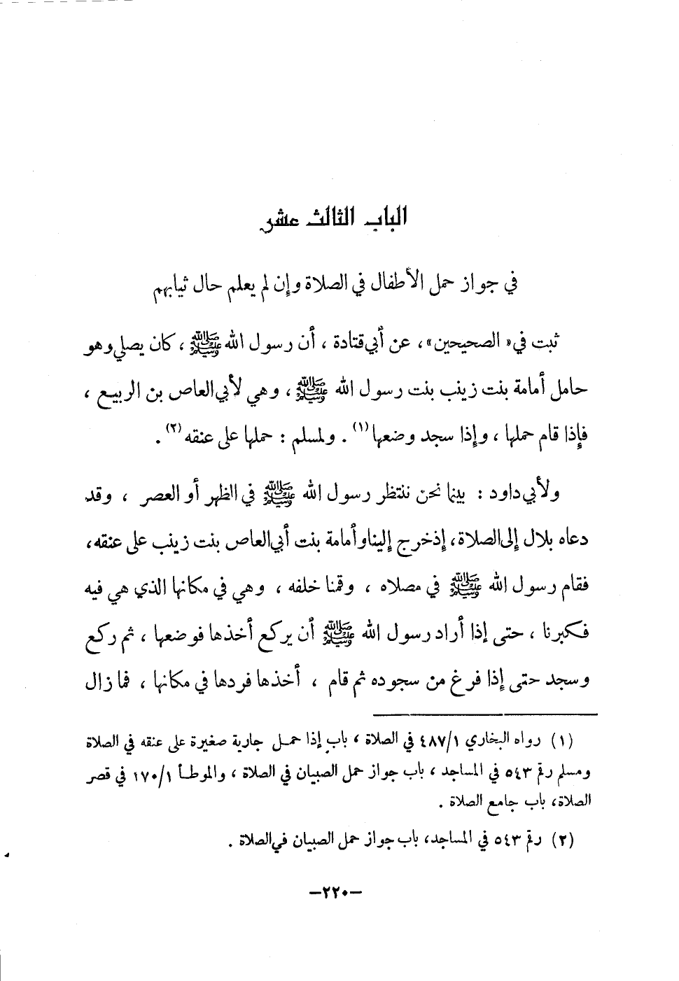 ثَبت فِي الصَّحِيحَيْنِ عَن أبي قَتَادَة أَن رَسُول الله صلى الله عَلَيْهِ وَسلم كَانَ يُصَلِّي وَهُوَ حَامِل أُمَامَة بنت زَيْنَب بنت رَسُول الله صلى الله عَلَيْهِ وَسلم وَهِي لأبي الْعَاصِ بن الرّبيع فَإِذا قَامَ حملهَا وَإِذا سجد وَضعهَا وَلمُسلم حملهَا على عُنُقه
