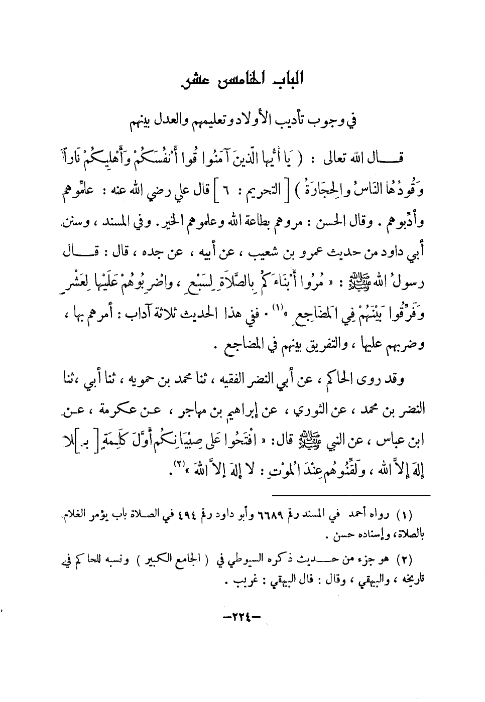 قَالَ الله تَعَالَى {يَا أَيهَا الَّذين آمنُوا قوا أَنفسكُم وأهليكم نَارا وقودها النَّاس وَالْحِجَارَة} التَّحْرِيم 6 قَالَ عَليّ رَضِي الله عَنهُ علموهم وأدبوهم وَقَالَ الْحسن مُرُوهُمْ بِطَاعَة الله وعلموهم الْخَيْر وَفِي الْمسند وَسنَن أبي دَاوُد من حَدِيث عَمْرو بن شُعَيْب عَن أَبِيه عَن جده قَالَ قَالَ رَسُول الله صلى الله عَلَيْهِ وَسلم مروا أبناءكم بِالصَّلَاةِ لسبع وَاضْرِبُوهُمْ عَلَيْهَا لعشر وَفرقُوا بَينهم فِي الْمضَاجِع فَفِي هَذَا الحَدِيث ثَلَاثَة آدَاب أَمرهم بهَا وضربهم عَلَيْهَا والتفريق بَينهم فِي الْمضَاجِع
