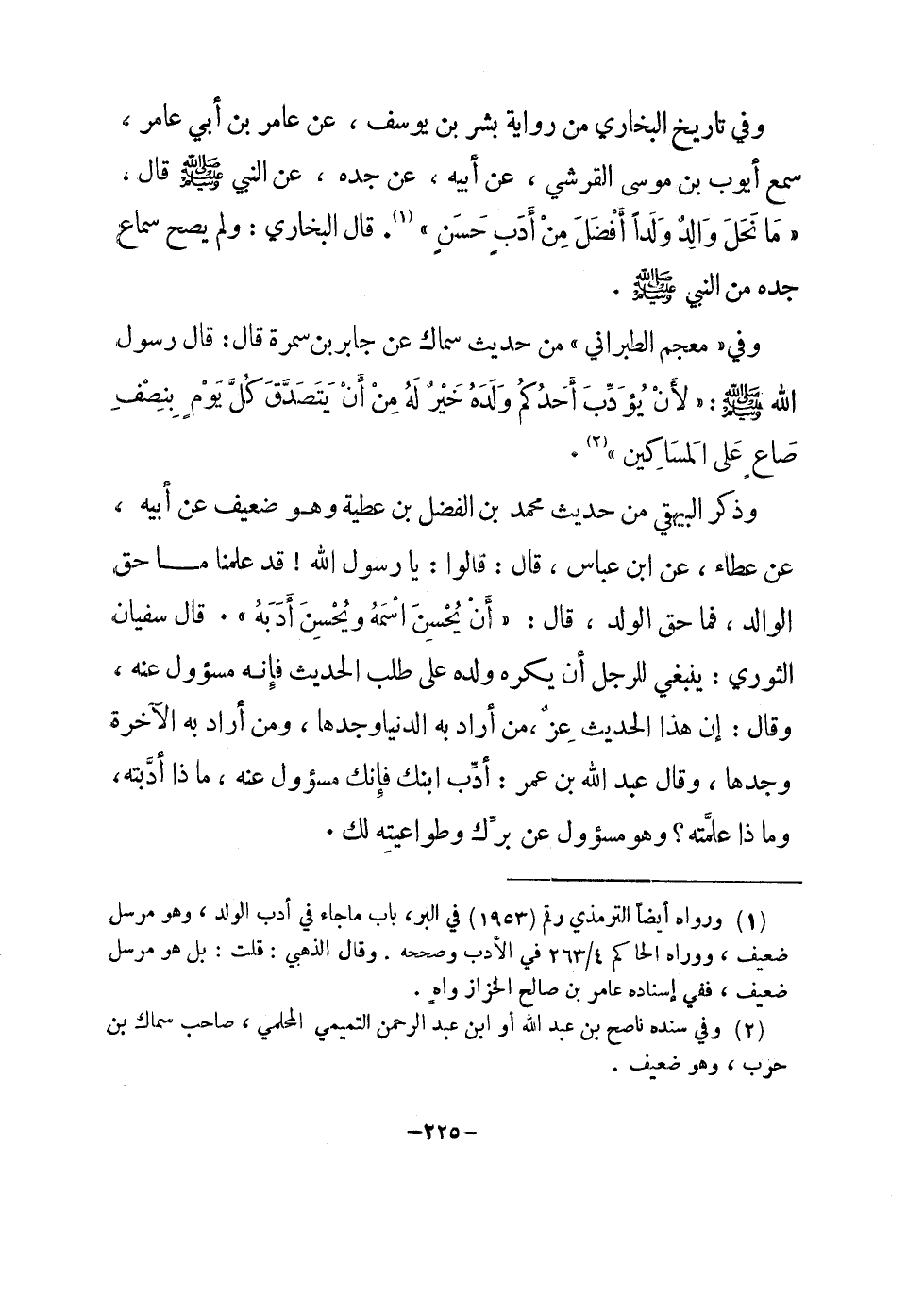 وَذكر الْبَيْهَقِيّ من حَدِيث مُحَمَّد بن الْفضل بن عَطِيَّة وَهُوَ ضَعِيف عَن أَبِيه عَن عَطاء عَن ابْن عَبَّاس قَالَ قَالُوا يَا رَسُول الله قد علمنَا مَا حق الْوَالِد فَمَا حق الْوَلَد قَالَ أَن يحسن اسْمه وَيحسن أدبه قَالَ سُفْيَان الثَّوْريّ يَنْبَغِي للرجل أَن يكره وَلَده على طلب الحَدِيث فَإِنَّهُ مسؤول عَنهُ وَقَالَ إِن هَذَا الحَدِيث عز من أَرَادَ بِهِ الدُّنْيَا وجدهَا وَمن أَرَادَ بِهِ الْآخِرَة وجدهَا وَقَالَ عبد الله بن عمر أدب ابْنك فَإنَّك مسؤول عَنهُ مَاذَا أدبته وماذا عَلمته وَهُوَ مسؤول عَن برك وطواعيته لَك