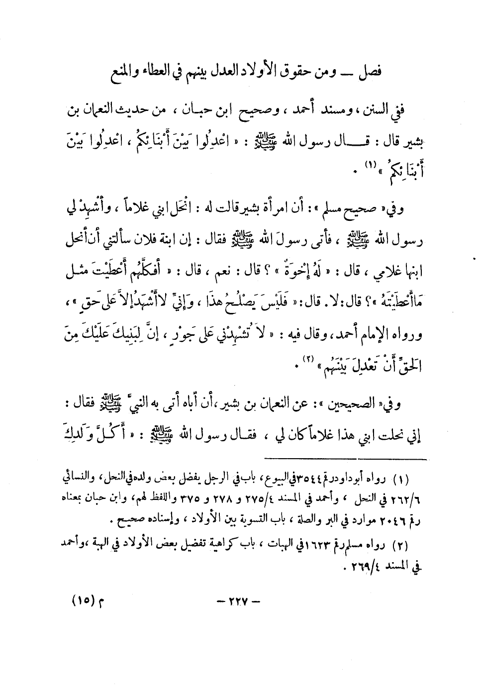 وَفِي صَحِيح مُسلم أَن امْرَأَة بشير قَالَت لَهُ انحل ابْني غُلَاما وَأشْهد لي رَسُول الله صلى الله عَلَيْهِ وَسلم فَأتى رَسُول الله صلى الله عَلَيْهِ وَسلم فَقَالَ إِن ابْنة فلَان سَأَلتنِي أَن أنحل ابْنهَا غلامي قَالَ لَهُ إخْوَة قَالَ نعم قَالَ أفكلهم أَعْطَيْت مثل مَا أَعْطيته قَالَ لَا قَالَ فَلَيْسَ يصلح هَذَا وَإِنِّي لَا أشهد إِلَّا على حق وَرَوَاهُ الإِمَام أَحْمد وَقَالَ فِيهِ لَا تشهدني على جور إِن لبنيك عَلَيْك من الْحق أَن تعدل بَينهم وَفِي الصَّحِيحَيْنِ عَن النُّعْمَان بن بشير أَن أَبَاهُ أَتَى بِهِ النَّبِي صلى الله عَلَيْهِ وَسلم فَقَالَ إِنِّي نحلت ابْني هَذَا غُلَاما كَانَ لي فَقَالَ رَسُول صلى الله عَلَيْهِ وَسلم أكل ولدك