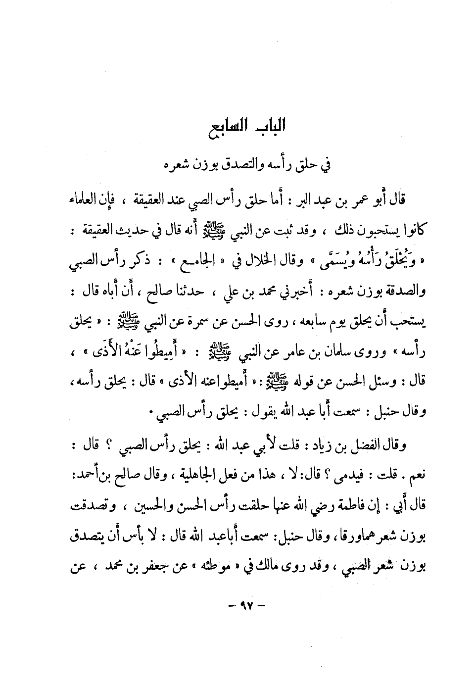 قَالَ أَبُو عمر بن عبد الْبر أما حلق رَأس الصَّبِي عِنْد الْعَقِيقَة فَإِن الْعلمَاء كَانُوا يستحبون ذَلِك وَقد ثَبت عَن النَّبِي صلى الله عَلَيْهِ وَسلم أَنه قَالَ فِي حَدِيث الْعَقِيقَة ويحلق رَأسه وَيُسمى وَقَالَ الْخلال فِي الْجَامِع ذكر رَأس الصَّبِي وَالصَّدَََقَة بِوَزْن شعره أَخْبرنِي مُحَمَّد بن عَليّ حَدثنَا صَالح أَن أَبَاهُ قَالَ يسْتَحبّ أَن يحلق يَوْم سابعه وروى الْحسن عَن سَمُرَة عَن النَّبِي صلى الله عَلَيْهِ وَسلم يحلق رَأسه وروى سلمَان بن عَامر عَن النَّبِي صلى الله عَلَيْهِ وَسلم أميطوا عَنهُ الْأَذَى قَالَ وَسُئِلَ الْحسن عَن قَوْله صلى الله عَلَيْهِ وَسلم أميطوا عَنهُ الْأَذَى قَالَ يحلق رَأسه وَقَالَ حَنْبَل سَمِعت أَبَا عبد الله يَقُول يحلق رَأس الصَّبِي