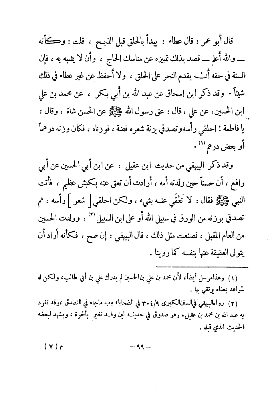 وَقد ذكر الْبَيْهَقِيّ من حَدِيث ابْن عقيل عَن ابْن أبي الْحُسَيْن عَن أبي رَافع أَن حسنا حِين وَلدته أمه أَرَادَت أَن تعق عَنهُ بكبش عَظِيم فَأَتَت النَّبِي صلى الله عَلَيْهِ وَسلم فَقَالَ لَا تعقي عَنهُ بِشَيْء وَلَكِن احلقي شعر رَأسه ثمَّ تصدقي بوزنه من الْوَرق فِي سَبِيل الله أَو على ابْن السَّبِيل وَولدت الْحُسَيْن من الْعَام الْمقبل فصنعت مثل ذَلِك قَالَ الْبَيْهَقِيّ إِن صَحَّ فَكَأَنَّهُ أَرَادَ أَن يتَوَلَّى الْعَقِيقَة عَنْهَا بِنَفسِهِ كَمَا روينَا
