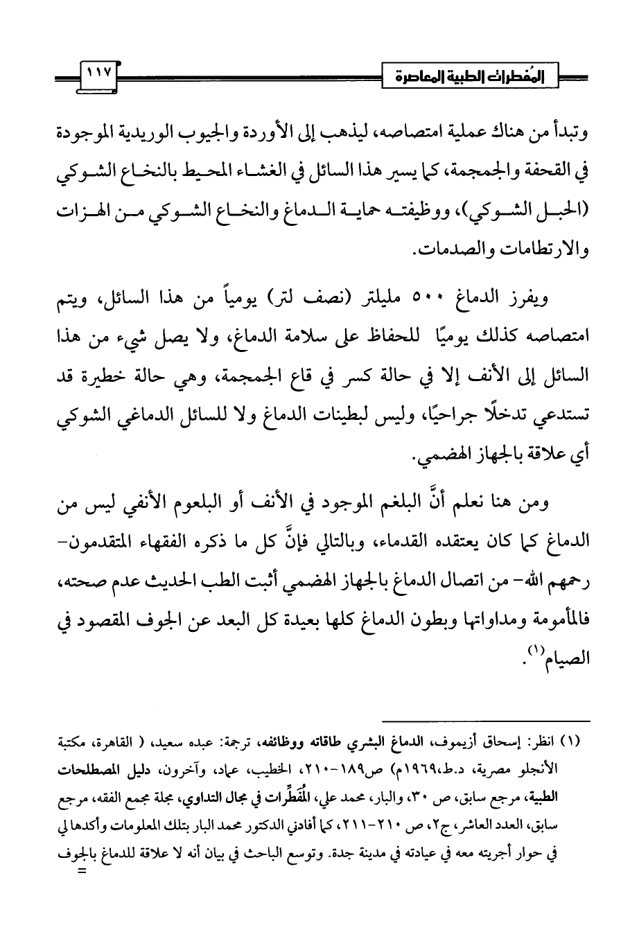 (¬1) انظر: إسحاق أزيموف، الدماغ البشري طاقاته ووظائفه، ترجمة: عبده سعيد، (القاهرة، مكتبة الأنجلو مصرية، د. ط،1969 م) ص 189 - 210، الخطيب، عماد، وآخرون، دليل المصطلحات الطبية، مرجع سابق، ص 30، والبار، محمد علي، المُفَطِّرات في مجال التداوي، مجلة مجمع الفقه، مرجع سابق، العدد العاشر، ج 2، ص 210 - 211، كما أفادني الدكتور محمد البار بتلك المعلومات وأكدها لي في حوار أجريته معه في عيادته في مدينة جدة. وتوسع الباحث في بيان أنه لا علاقة للدماغ بالجوف المؤثر في الصيام؛ لأنّ الفقهاء المتقدمين –رحمهم الله- كانوا يعتقدون أن الدماغ جوف مؤثر، وأنّ له منفذًا إلى المعدة، وهو ما بيَّن الطب المعاصر عدم صحته.