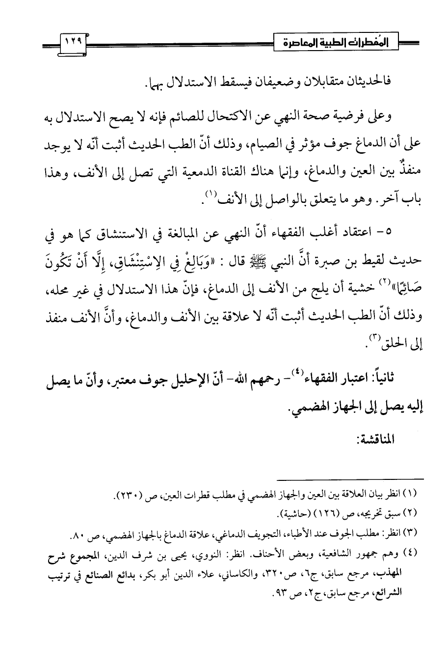 5 - اعتقاد أغلب الفقهاء أنّ النهي عن المبالغة في الاستنشاق كما هو في حديث لقيط بن صبرة أنَّ النبي - صلى الله عليه وسلم - قال: «وَبَالِغْ فِي الِاسْتِنْشَاقِ، إِلَّا أَنْ تَكُونَ صَائِمًا» (¬2) خشية أن يلج من الأنف إلى الدماغ، فإنّ هذا الاستدلال في غير محله، وذلك أنّ الطب الحديث أثبت أنّه لا علاقة بين الأنف والدماغ، وأنَّ الأنف منفذ إلى الحلق (¬3).