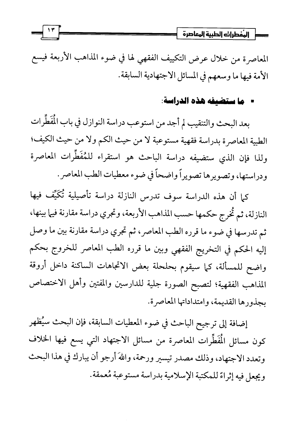 إضافة إلى ترجيح الباحث في ضوء المعطيات السابقة، فإن البحث سيُظهر كون مسائل المُفَطِّرات المعاصرة من مسائل الاجتهاد التي يسع فيها الخلاف وتعدد الاجتهاد، وذلك مصدر تيسير ورحمة، واللهَ أرجو أن يبارك في هذا البحث ويجعل فيه إثراءً للمكتبة الإسلامية بدراسة مستوعبة مُعمقة.