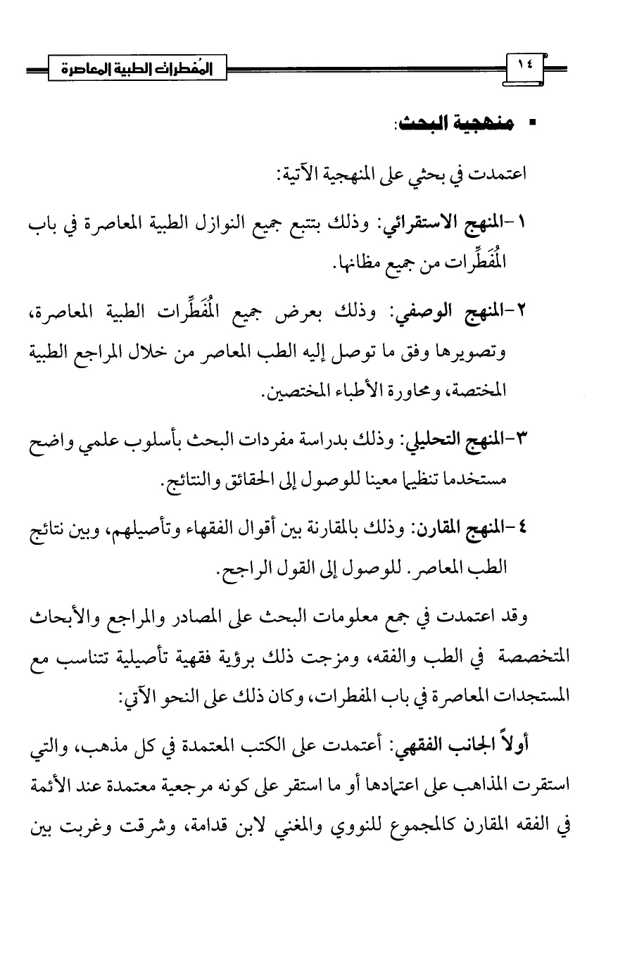 4 - المنهج المقارن: وذلك بالمقارنة بين أقوال الفقهاء وتأصيلهم، وبين نتائج الطب المعاصر. للوصول إلى القول الراجح.