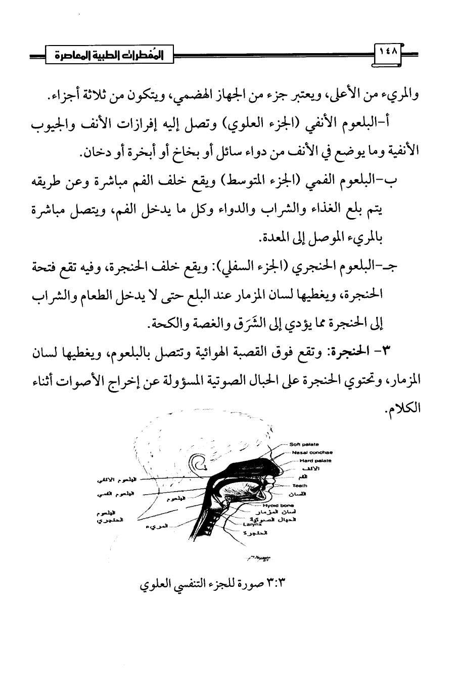 جـ-البلعوم الحنجري (الجزء السفلي): ويقع خلف الحنجرة، وفيه تقع فتحة الحنجرة، ويغطيها لسان المزمار عند البلع حتى لا يدخل الطعام والشراب إلى الحنجرة مما يؤدي إلى الشَرَق والغصة والكحة.