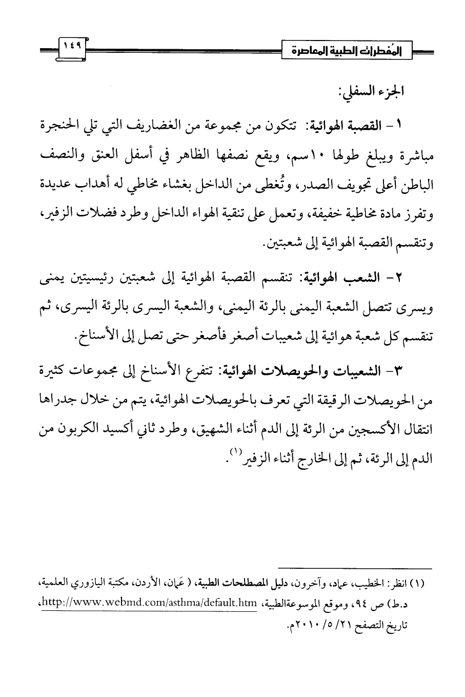 (¬1) انظر: الخطيب، عماد، وآخرون، دليل المصطلحات الطبية، (عَمان، الأردن، مكتبة اليازوري العلمية، د. ط) ص 94، وموقع الموسوعةالطبية، http://www.webmd.com/asthma/default.htm، تاريخ التصفح 21/ 5/2010 م.