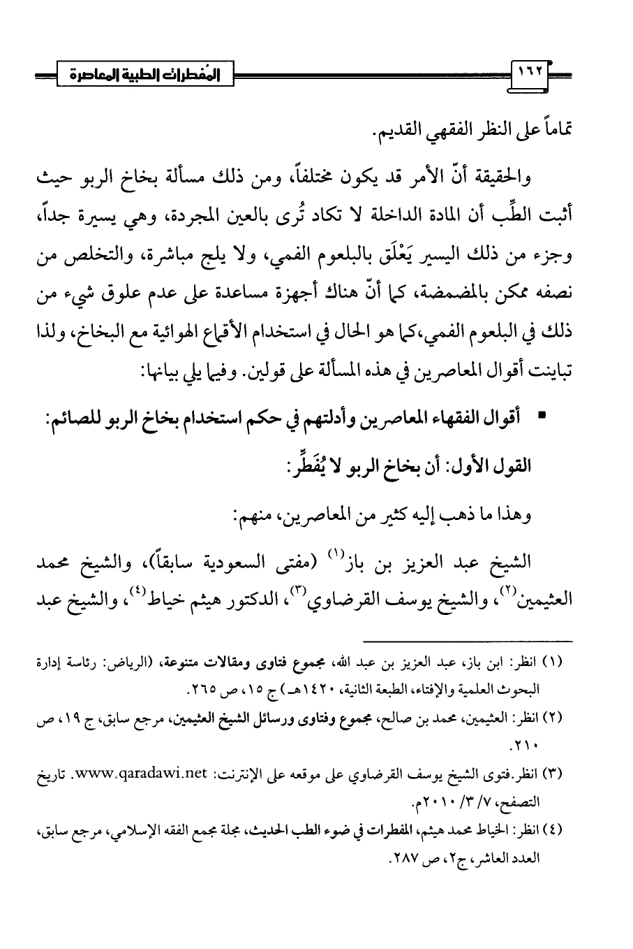 (¬4) انظر: الخياط محمد هيثم، المفطرات في ضوء الطب الحديث، مجلة مجمع الفقه الإسلامي، مرجع سابق، العدد العاشر، ج 2، ص 287.