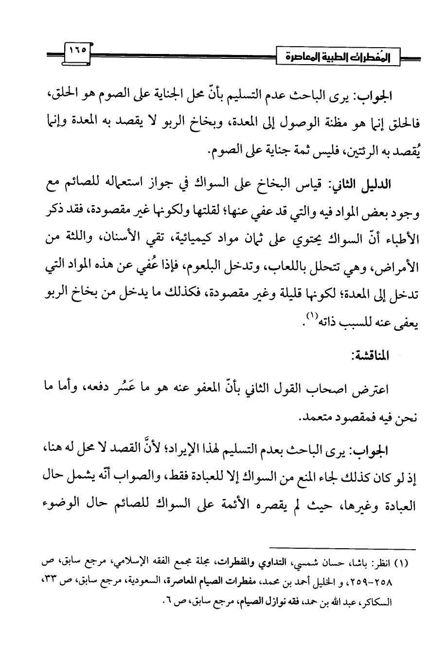 (¬1) انظر: باشا، حسان شمسي، التداوي والمفطرات، مجلة مجمع الفقه الإسلامي، مرجع سابق، ص 258 - 259، والخليل أحمد بن محمد، مفطرات الصيام المعاصرة، السعودية، مرجع سابق، ص 33، السكاكر، عبد الله بن حمد، فقه نوازل الصيام، مرجع سابق، ص 6.