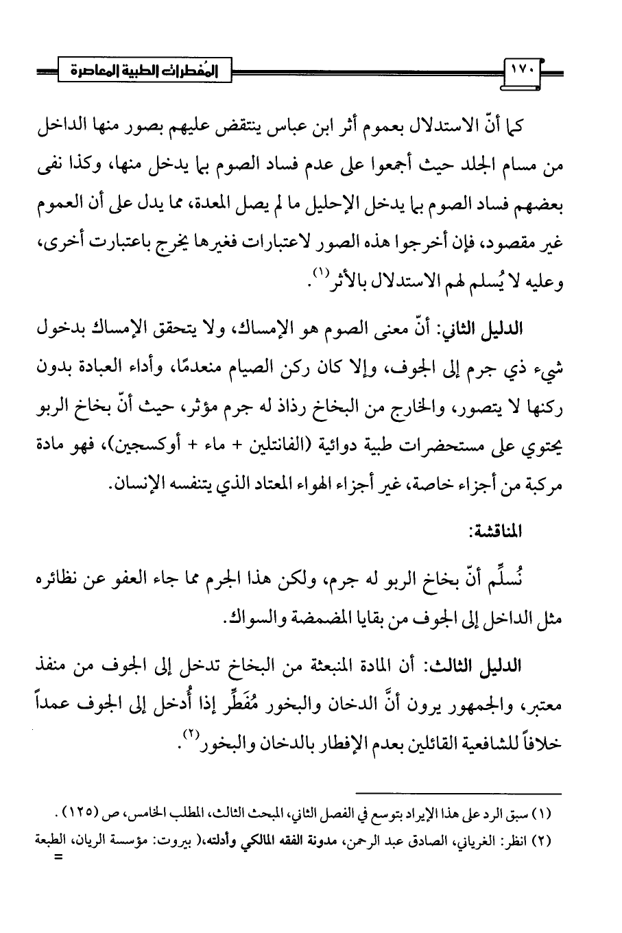 (¬2) انظر: الغرياني، الصادق عبد الرحمن، مدونة الفقه المالكي وأدلته، (بيروت: مؤسسة الريان، الطبعة الأولى 1423 هـ ـ 2002 م) ج 1، ص 631، والألفي، محمد جبر، مفطرات الصائم في ضوء المستجدات الطبية، مجلة مجمع الفقه الإسلامي، مرجع سابق، العدد العاشر، ج 2، ص 76.